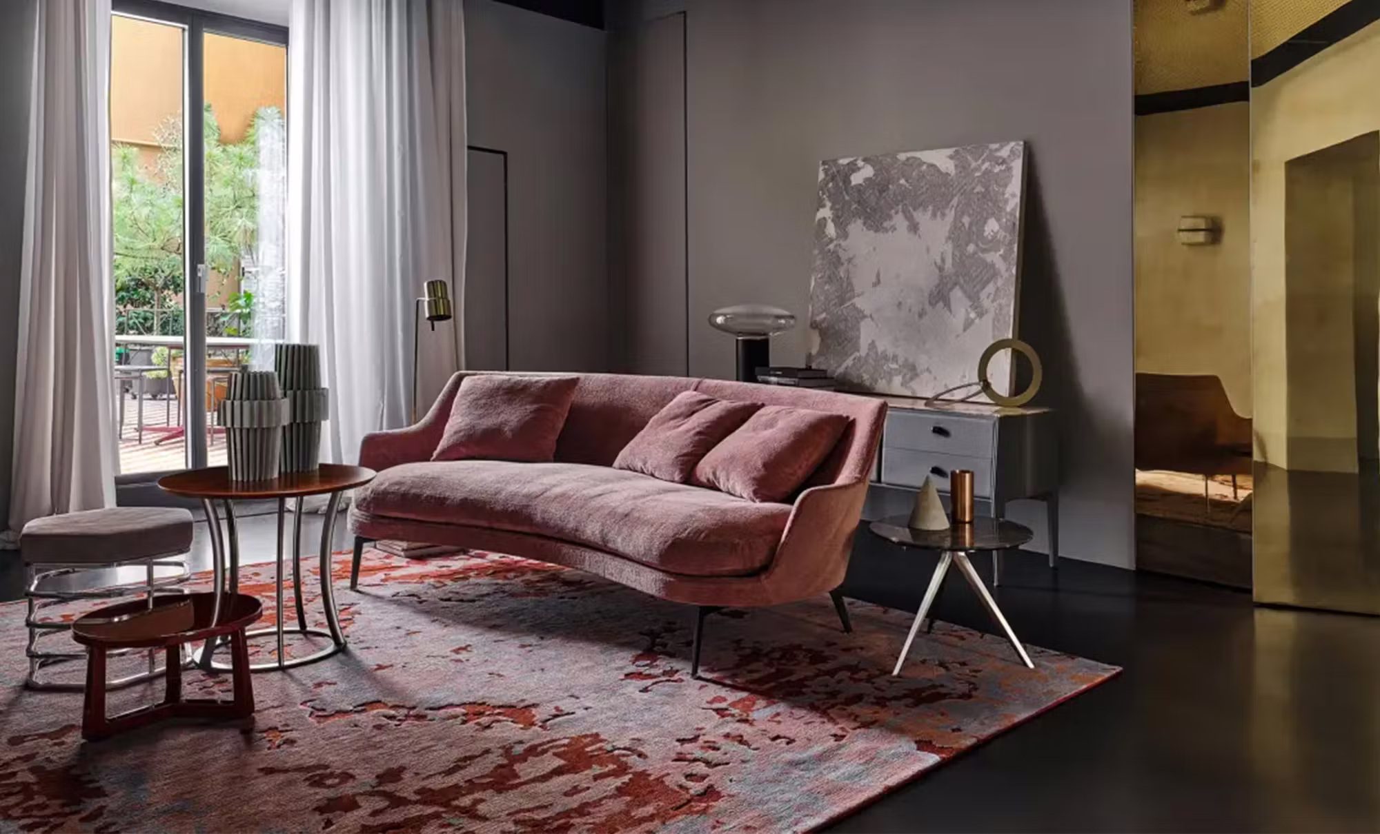 A powerful encapsulation of elegance and quality, the Guscio sofa has enveloping lines and impeccable construction, features that enhance its natural aptitude for furnishing both residential homes and hospitality spaces – like lounge areas, corporate offices and boutiques – with a flair for warmth and coziness. The structure is an enveloping shell made of structural polyurethane foam, while the seat cushion is in goose down with a core insert in crushproof material. The sophisticated aesthetic language that distinguishes the Guscio sofa is also expressed in the design of the solid wood base, in various colors, or metal, in a number of finishes. The Guscio sofa comes in two widths: 128 cm width with base in wood or metal, and 220 cm width that is only available with the metal base.