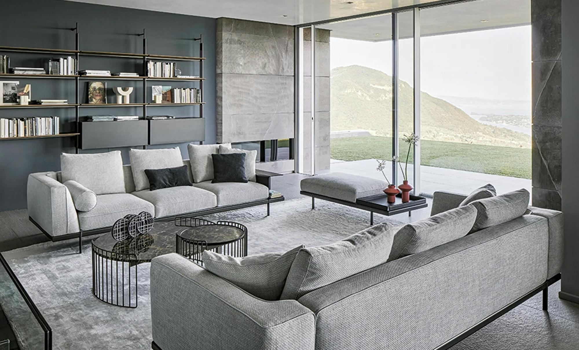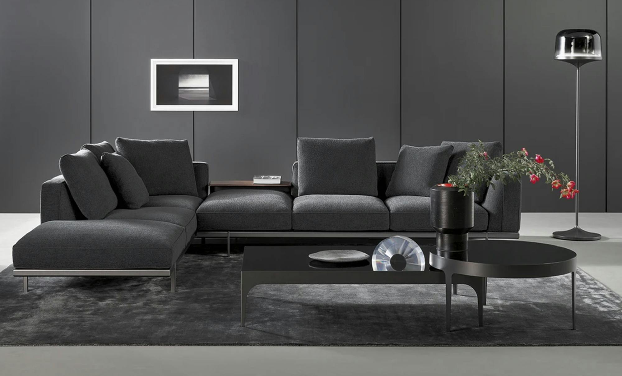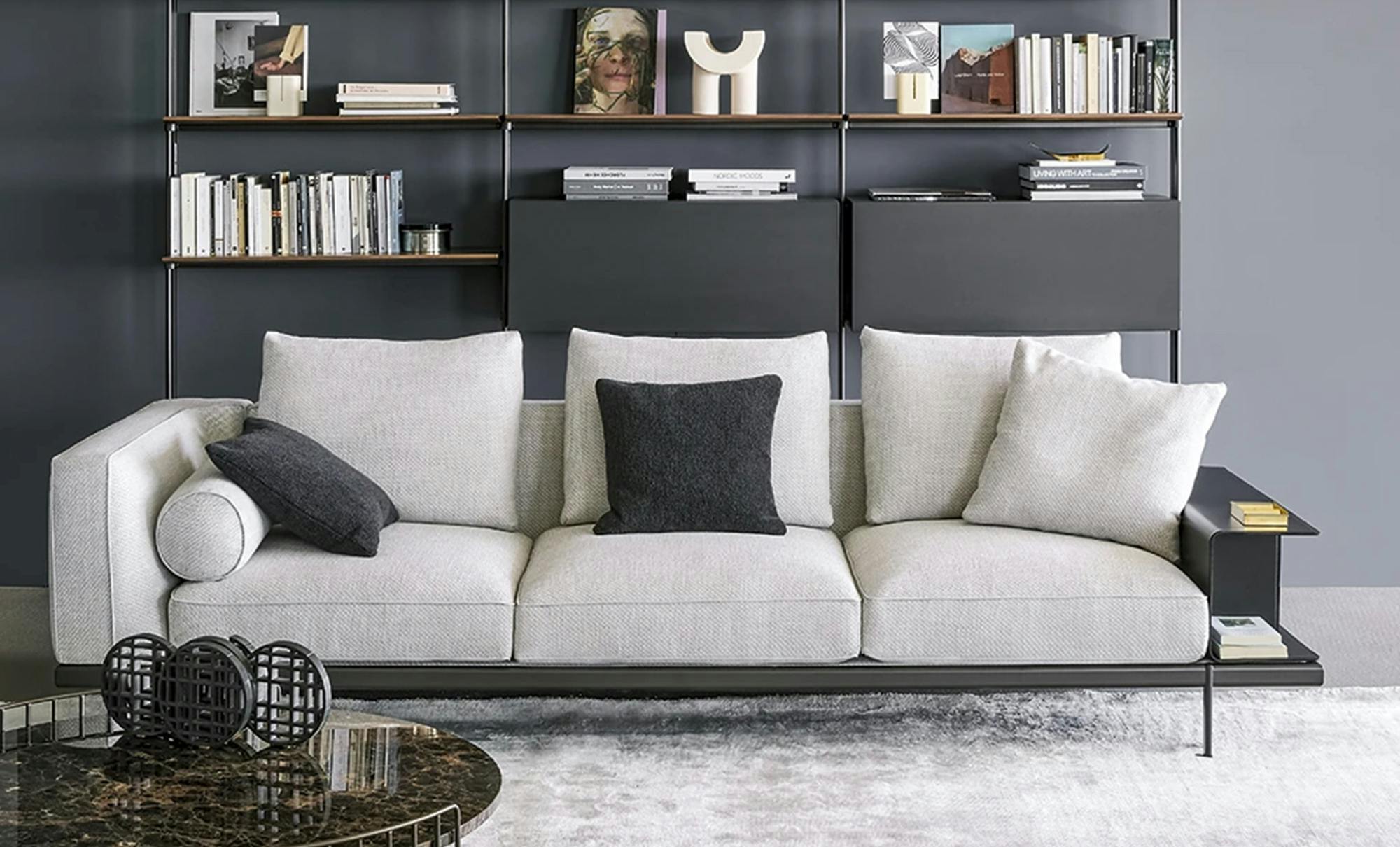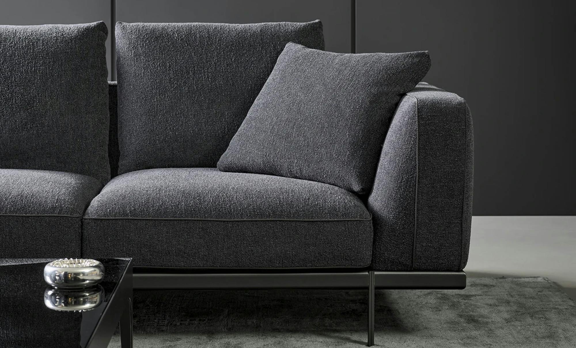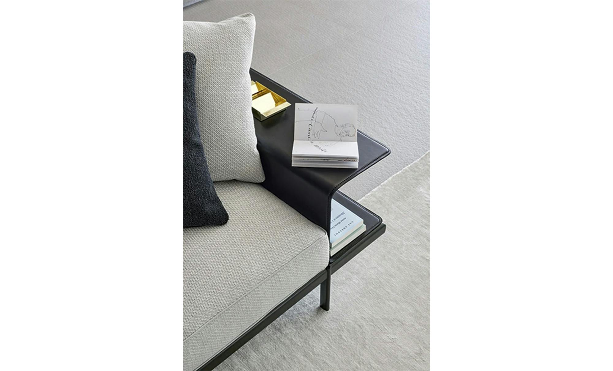 An elegant personality, a frame with a sense of lightness and generous upholstery are the characteristics that make Phil a suitable piece of furniture for any living area. The clean and rigorous lines of this sofa design are best emphasized by the detail present in the profile of the cushions, an original ornamental border in grosgrain which is available either in contrast or tone on tone for a uniform effect. The sofa is full of details and sartorial elements such as armrests, armrests with magazine rack, trays and tops in leather that complete and personalize the sofa, resulting in an elegant and versatile design. The Phil collection is available in the “Casual” version whose back cushions are reduced in size with spaces between them and the “Linear” version with larger back cushions side by side.