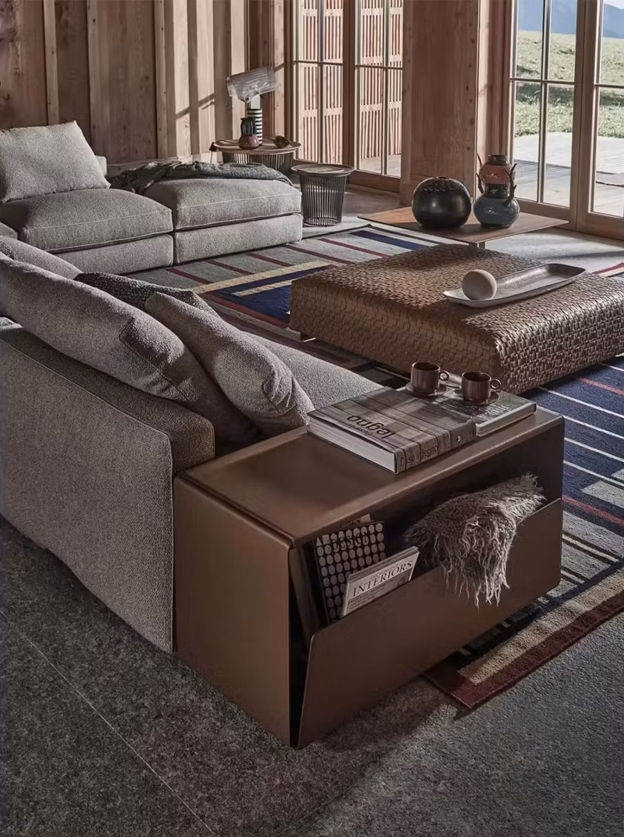 The Harper seating system has an innately elegant appeal, thanks to its balanced proportions, couture tailoring of the upholstery and exquisite handcrafted details. Saddle-hide-clad console armrests lend Harper distinctive good looks. Made of thin metal sheet clad in cowhide and available in two widths, the armrests are tailored to perform various functions. The compartment can be used to store throws, magazines, books; the handy shelf provides at-hand organization of everyday items, like remotes. Seen from the side and the back, the Harper sofa reveals refined construction details that highlight its understated elegance. The generously padded structure is finished with cowhide or metal details, available in an array of sophisticated colors and finishes. The Harper sofa comes in three depths – 99 cm, 111 cm and 126 cm – and the numerous available elements, as well as the countless combinations that can be created between fabric and leather upholstery and cowhide details, make it an extraordinarily versatile seating system that is effortlessly at home in the most diverse settings.