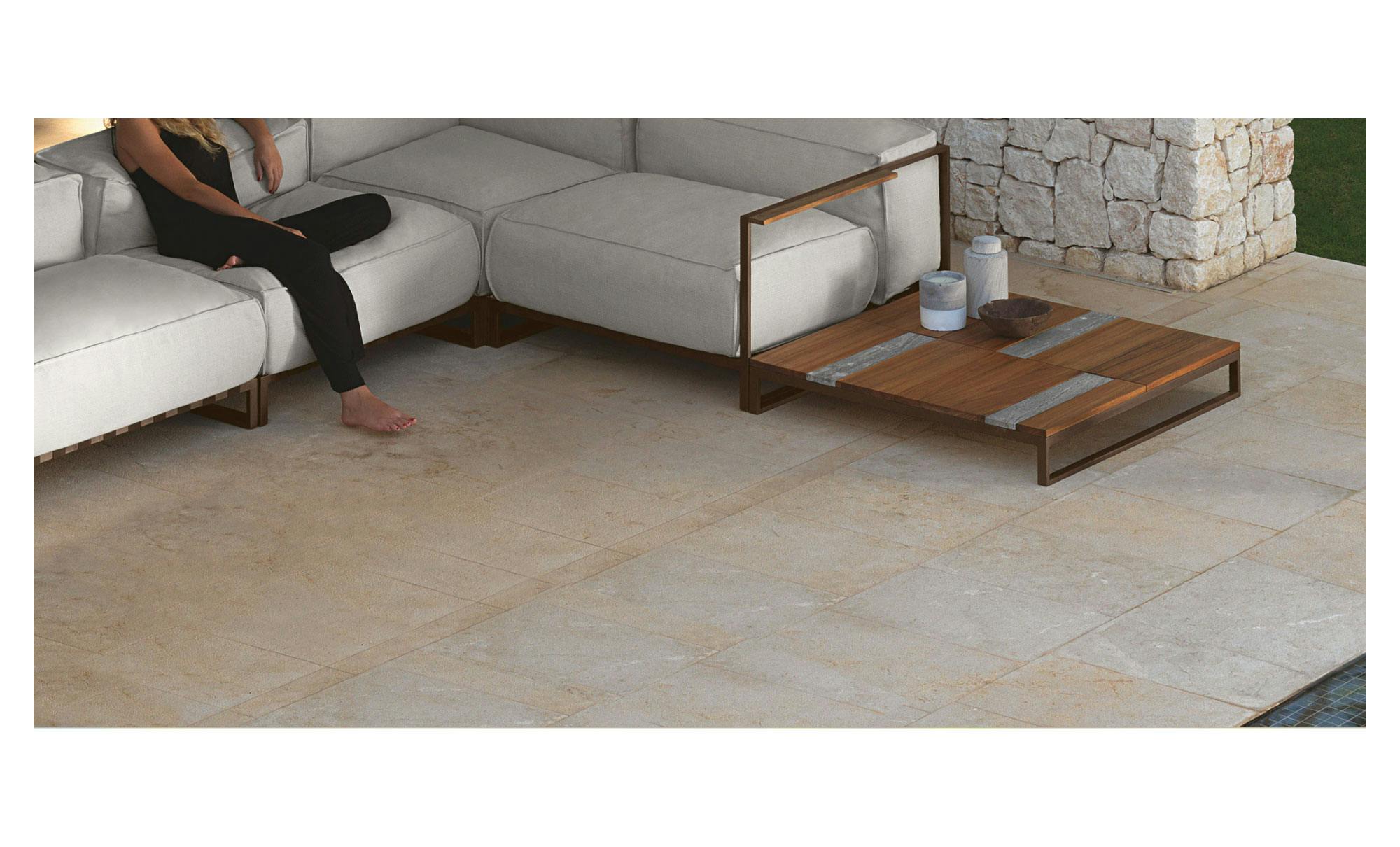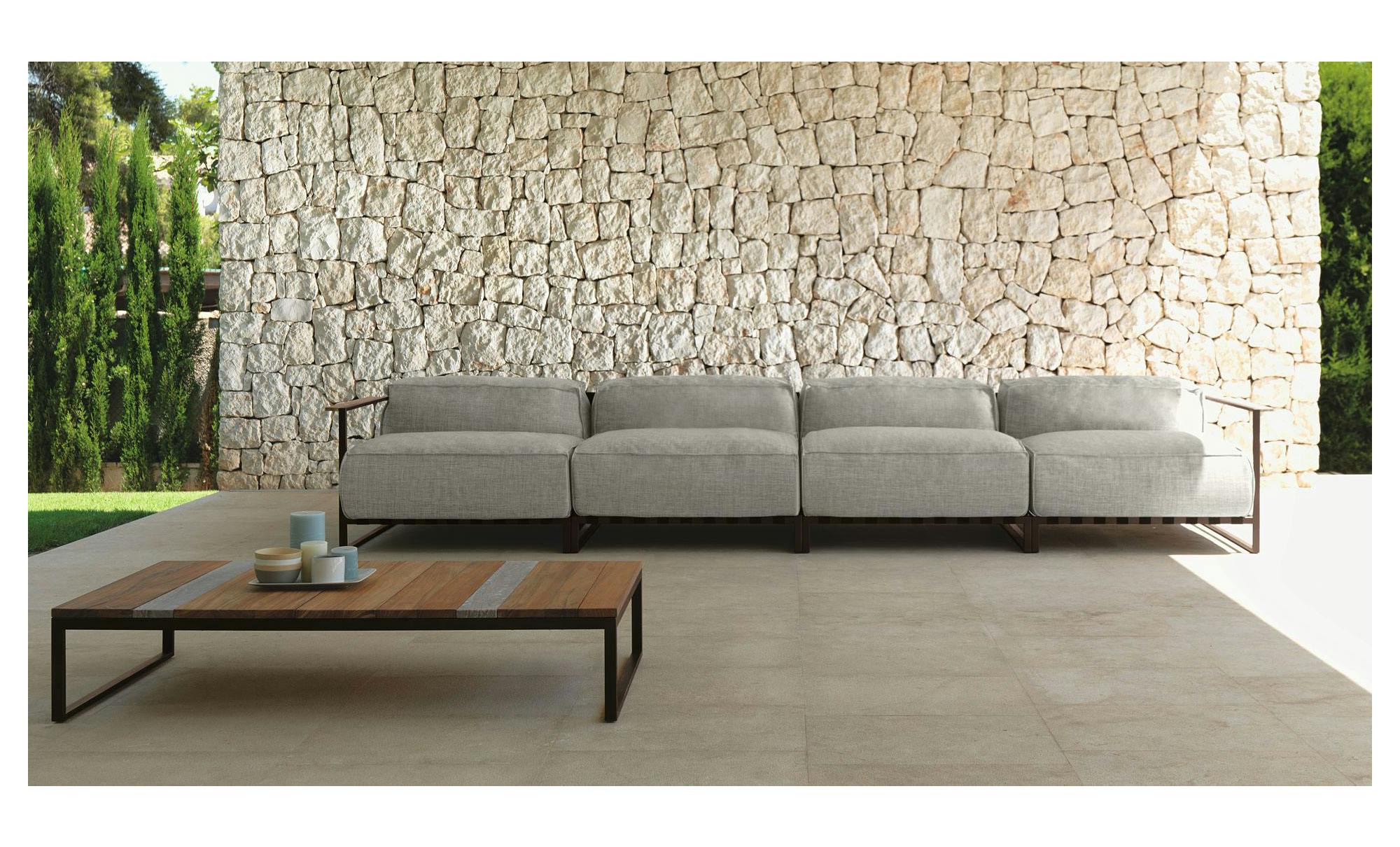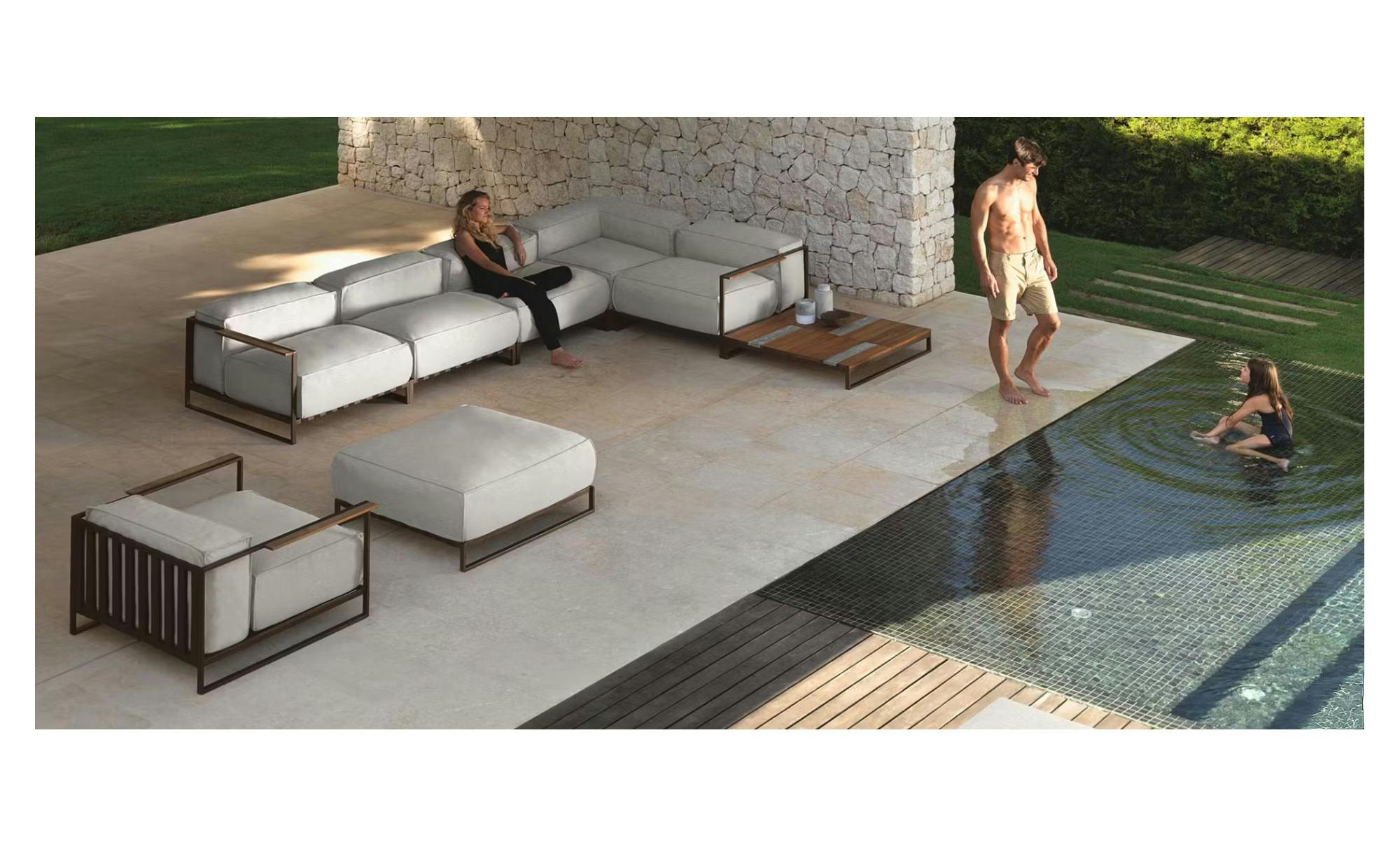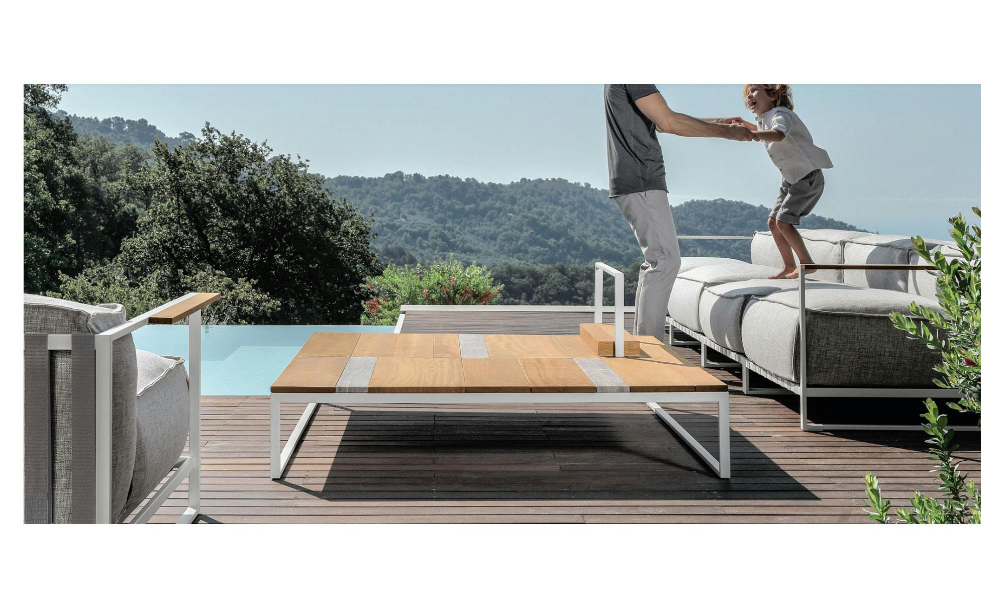 The Casilda coffee table with a stainless steal frame powder coated and iroko wood top is combined with marble slat according to the colour base.