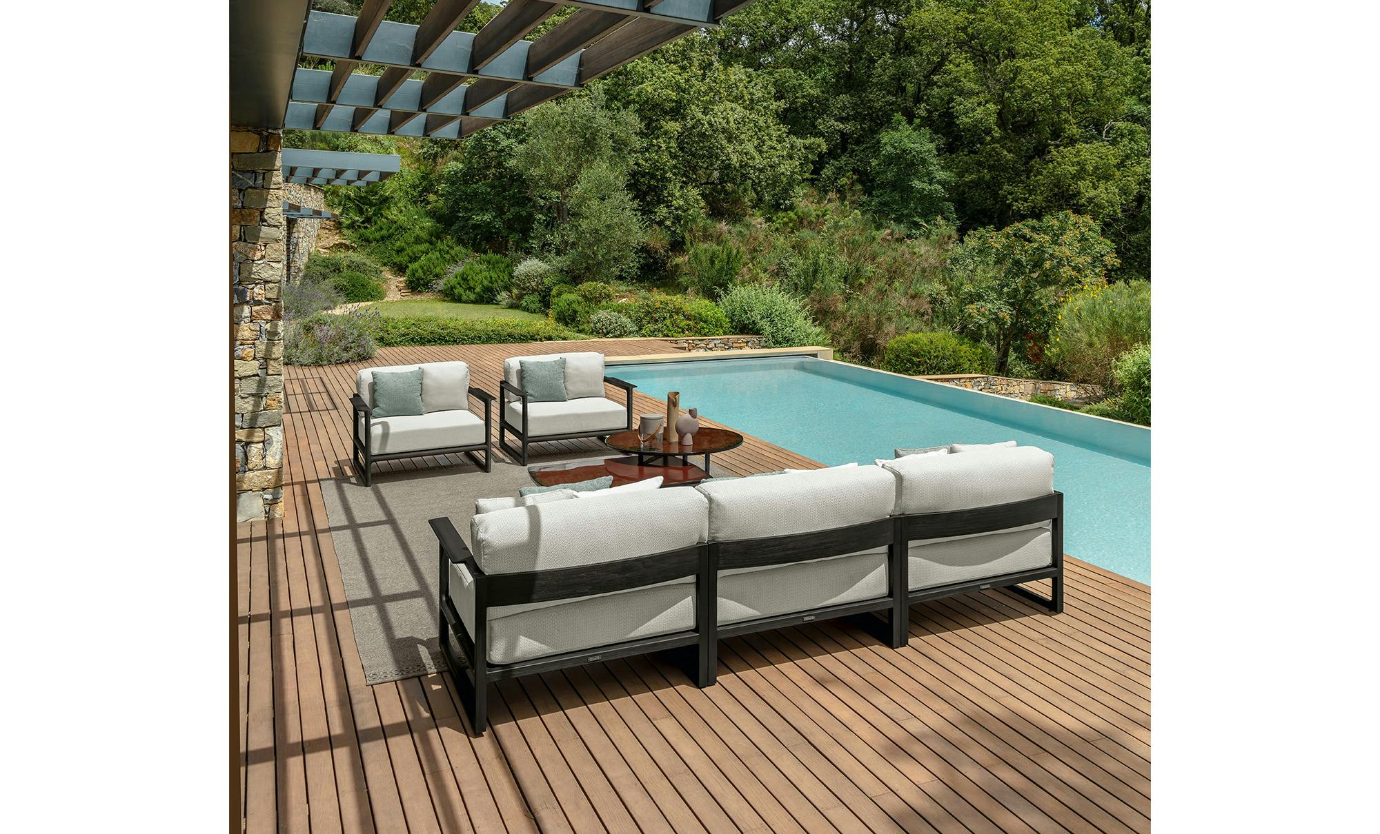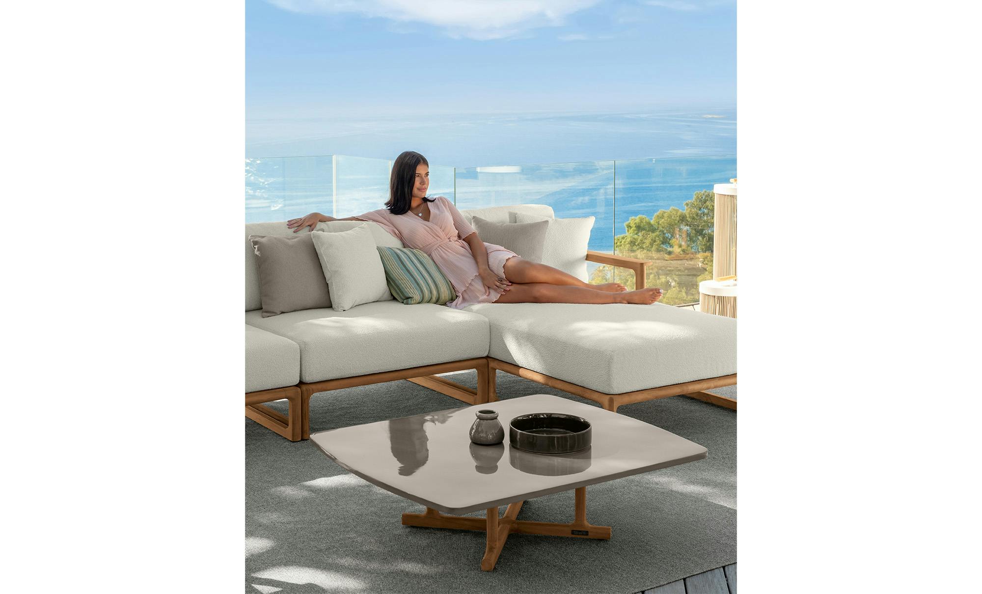 The Thea coffee table is designed to integrate seamlessly into elegant and functional outdoor environments. Made with a teak structure that highlights its stability and refined design, the coffee table stands out for its softly rounded tabletop, adding a contemporary and harmonious touch to the overall piece.