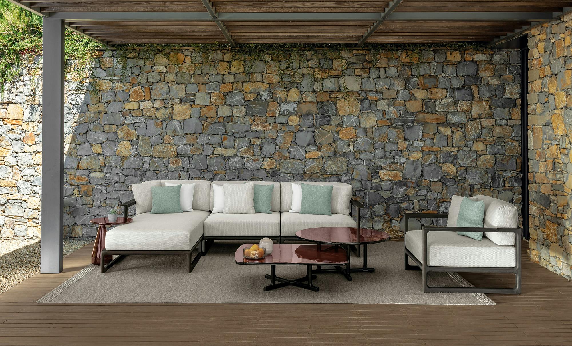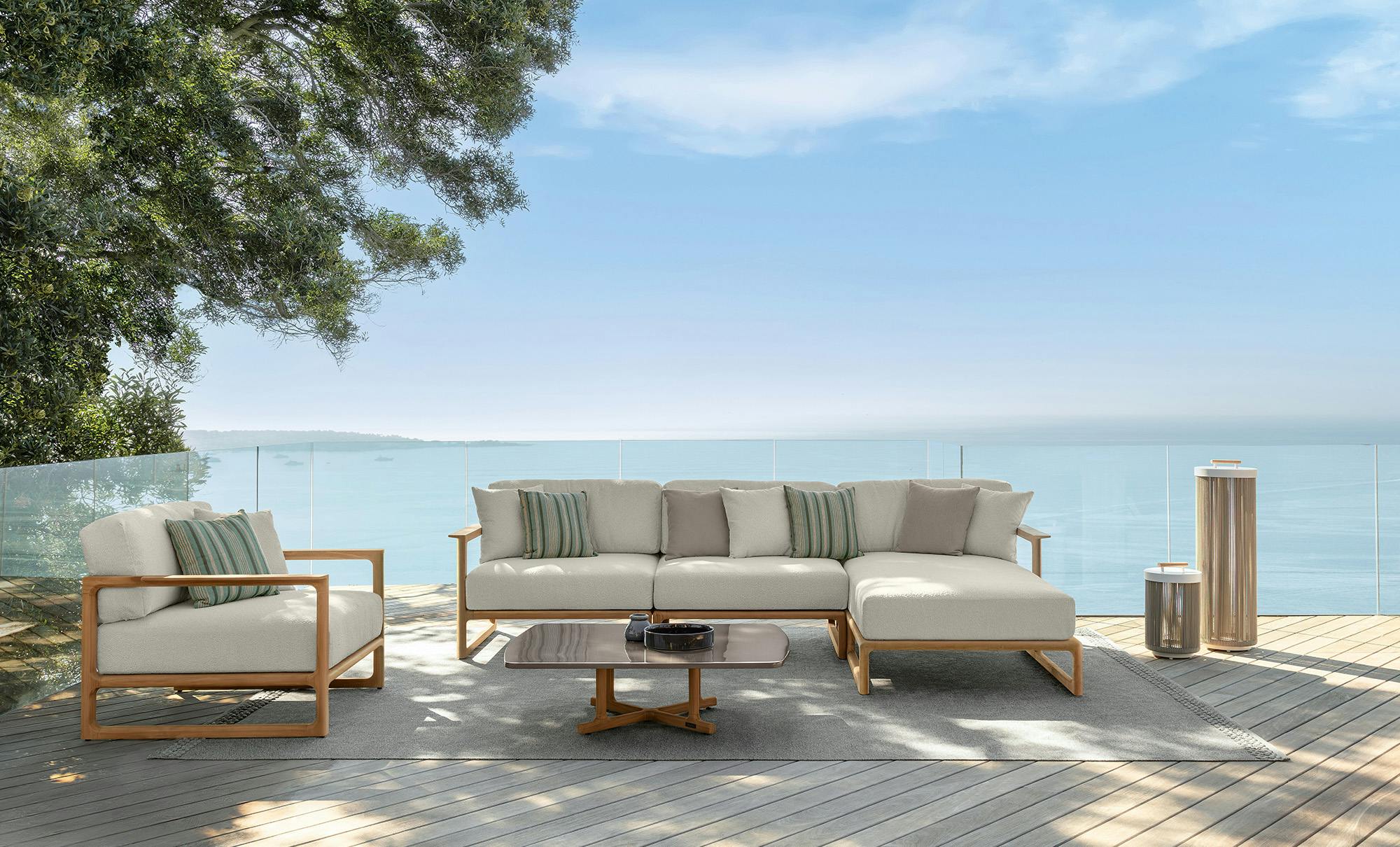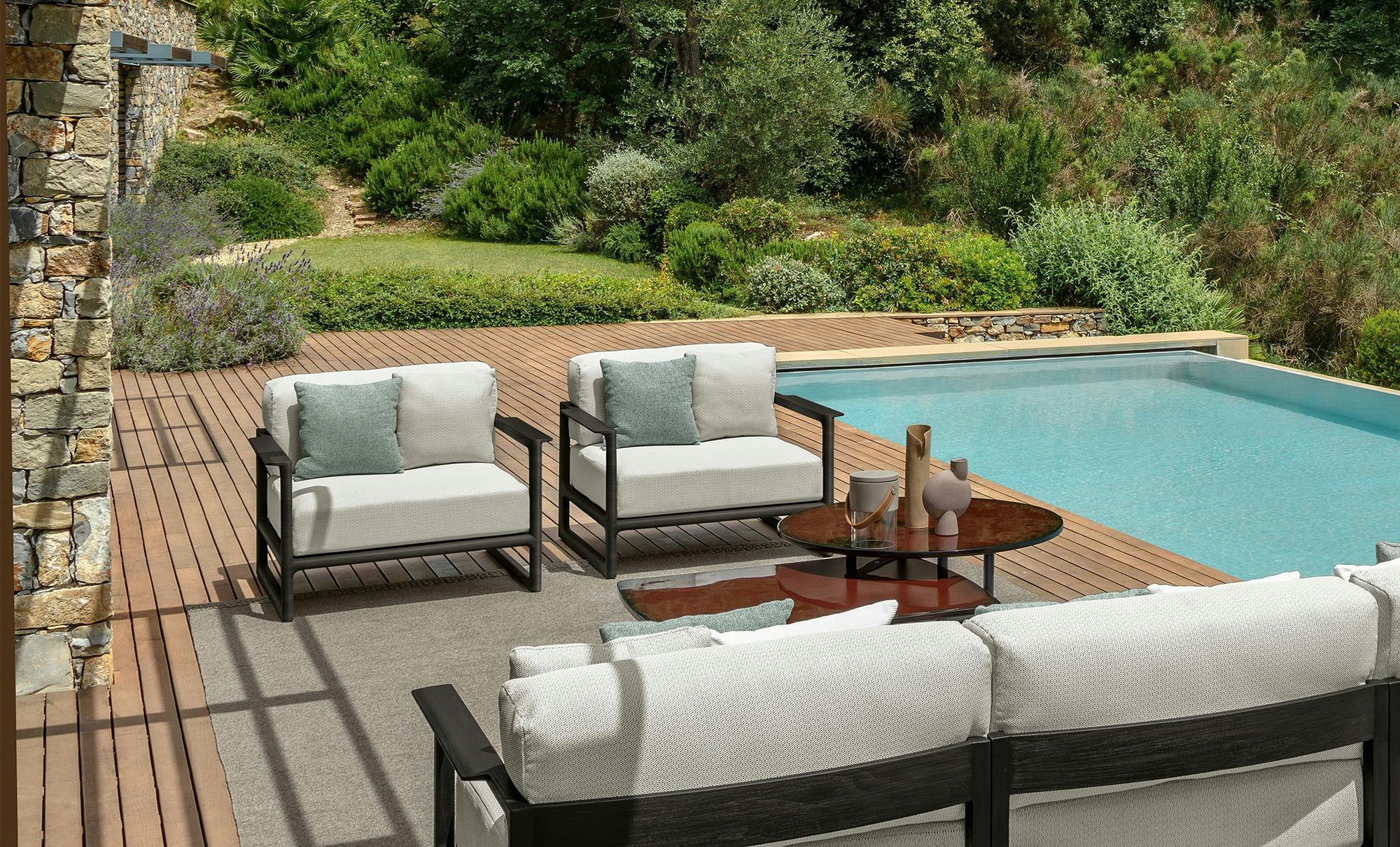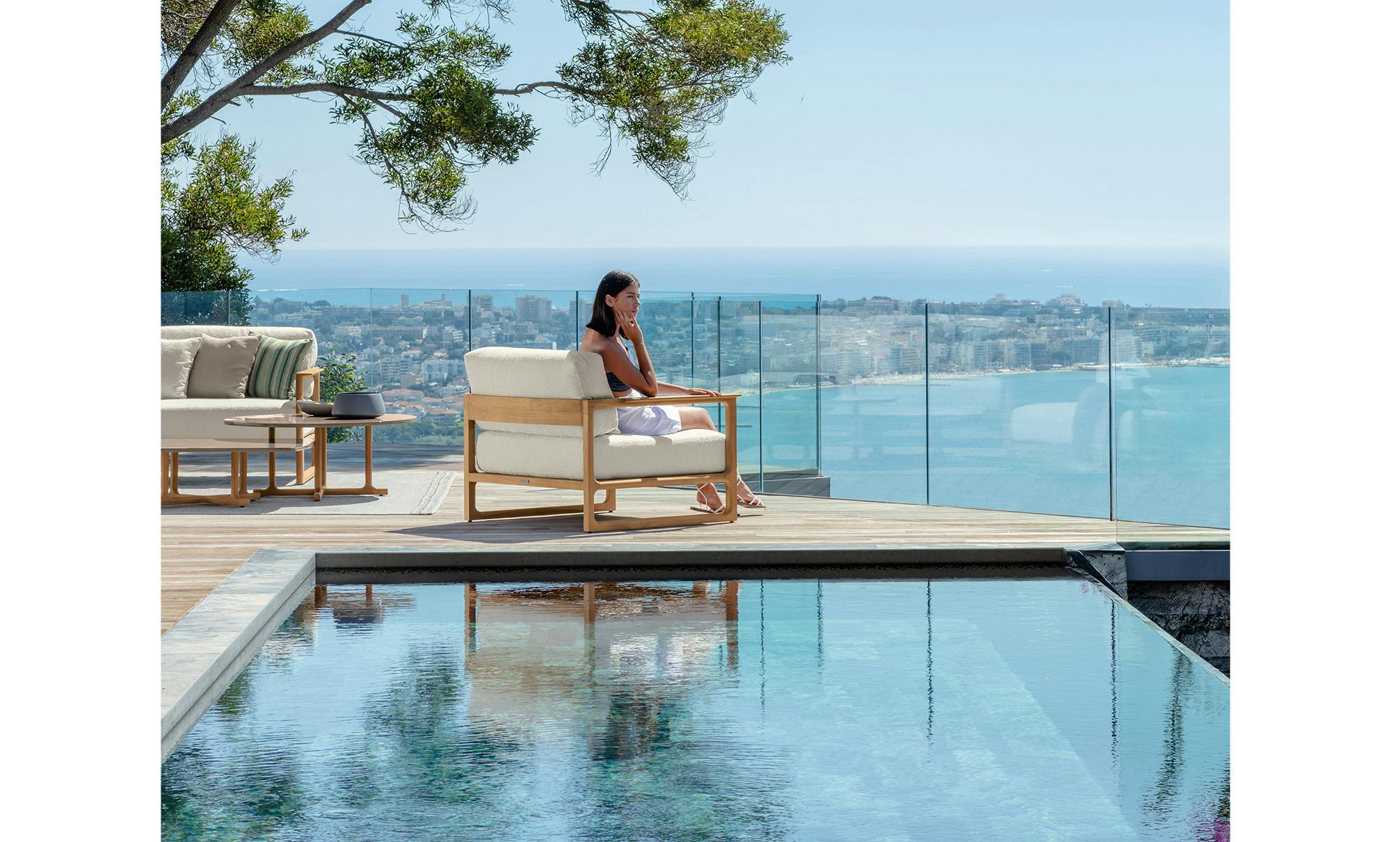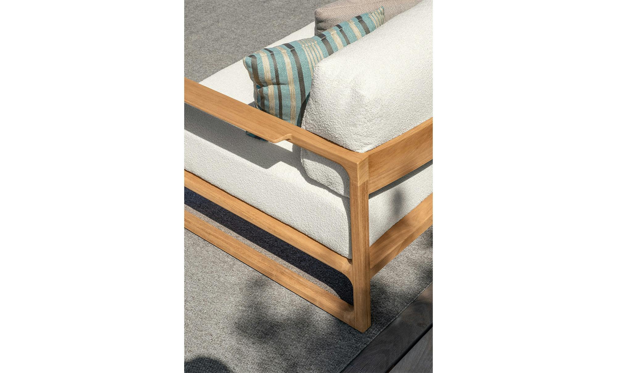 The Thea living armchair, modern and minimalist, features a wooden structure with straight lines and open armrests, creating a simple and refined aesthetic. The seat and backrest, upholstered in fabric, offer an elegant look alongside the wooden frame. This armchair is suitable for sophisticated living spaces aiming for a contemporary yet cozy design.