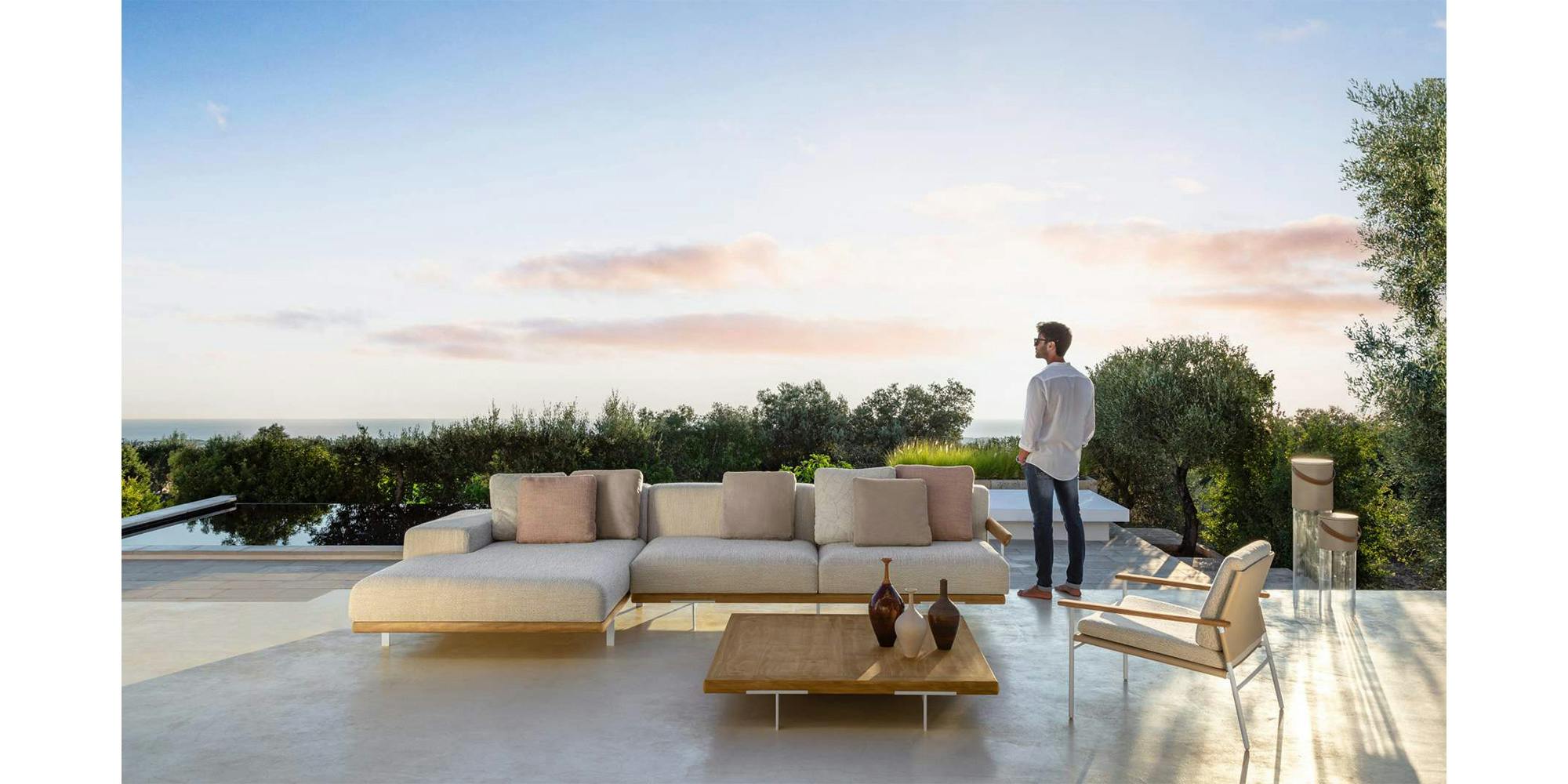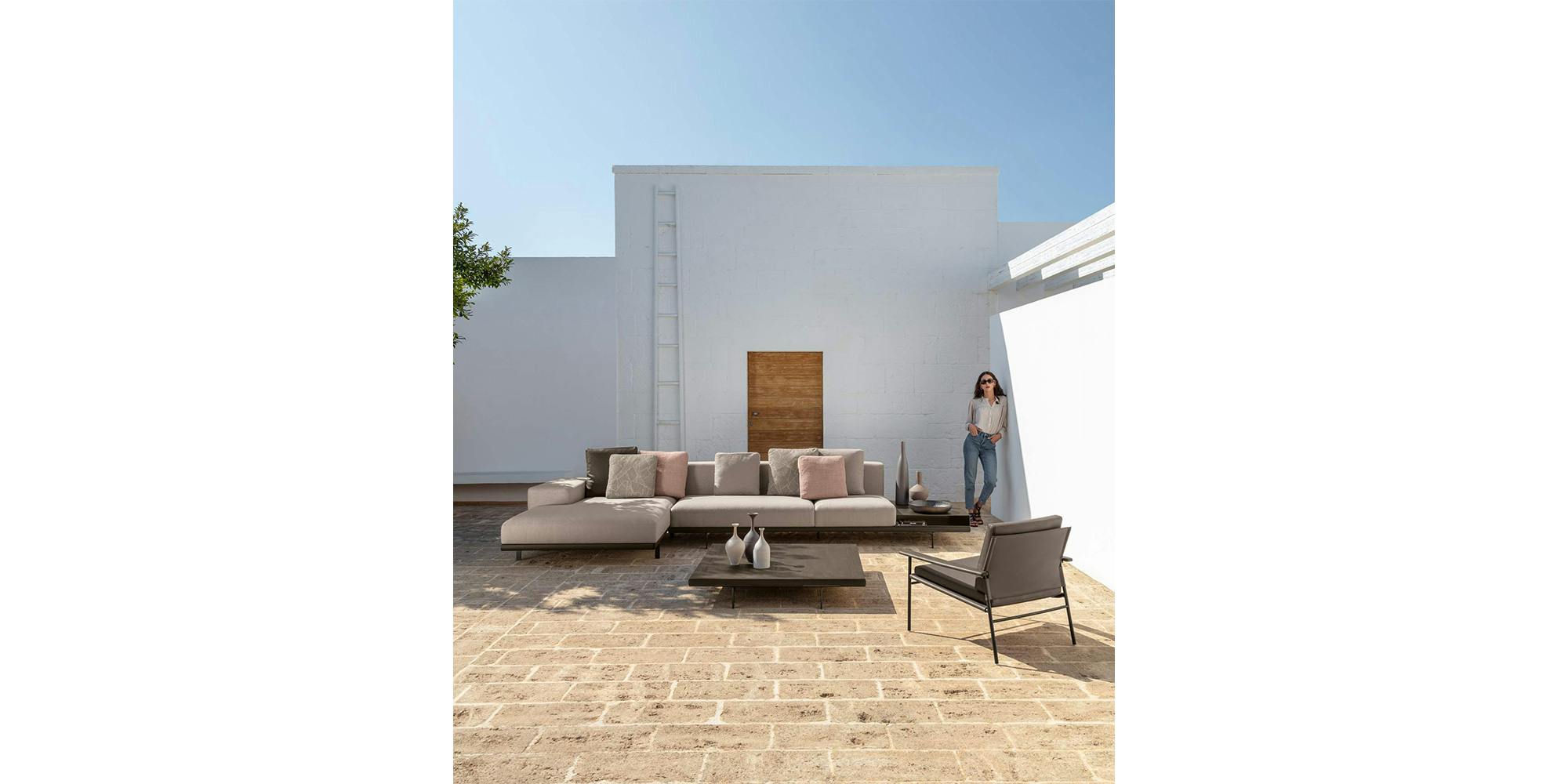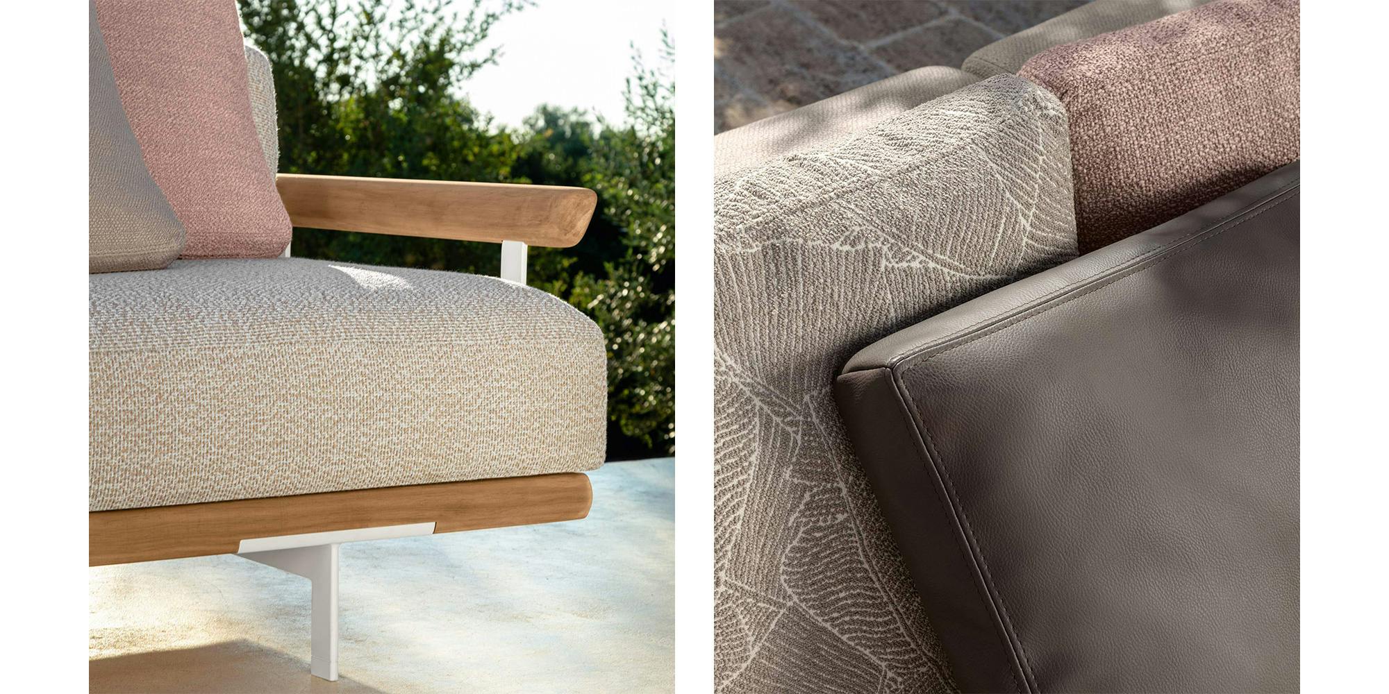 The Allure outdoor modular sofa stands out thanks to a solid wooden frame, supported by elegant aluminium feet. A contemporary sofa bound to tradition. The linear geometry of the cushions, combined with the design of the armrests, available in two versions, allows endless combinations, each with its own character and style. Thanks to its unusual modularity, design variability, and resistant materials, the outdoor space appears informal yet elegant.
