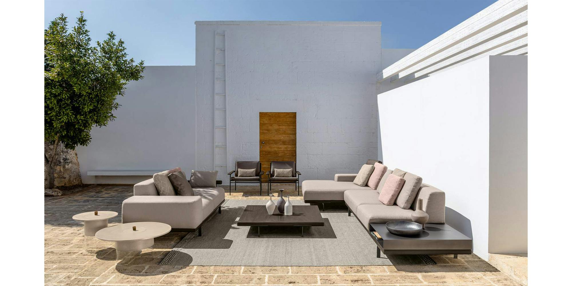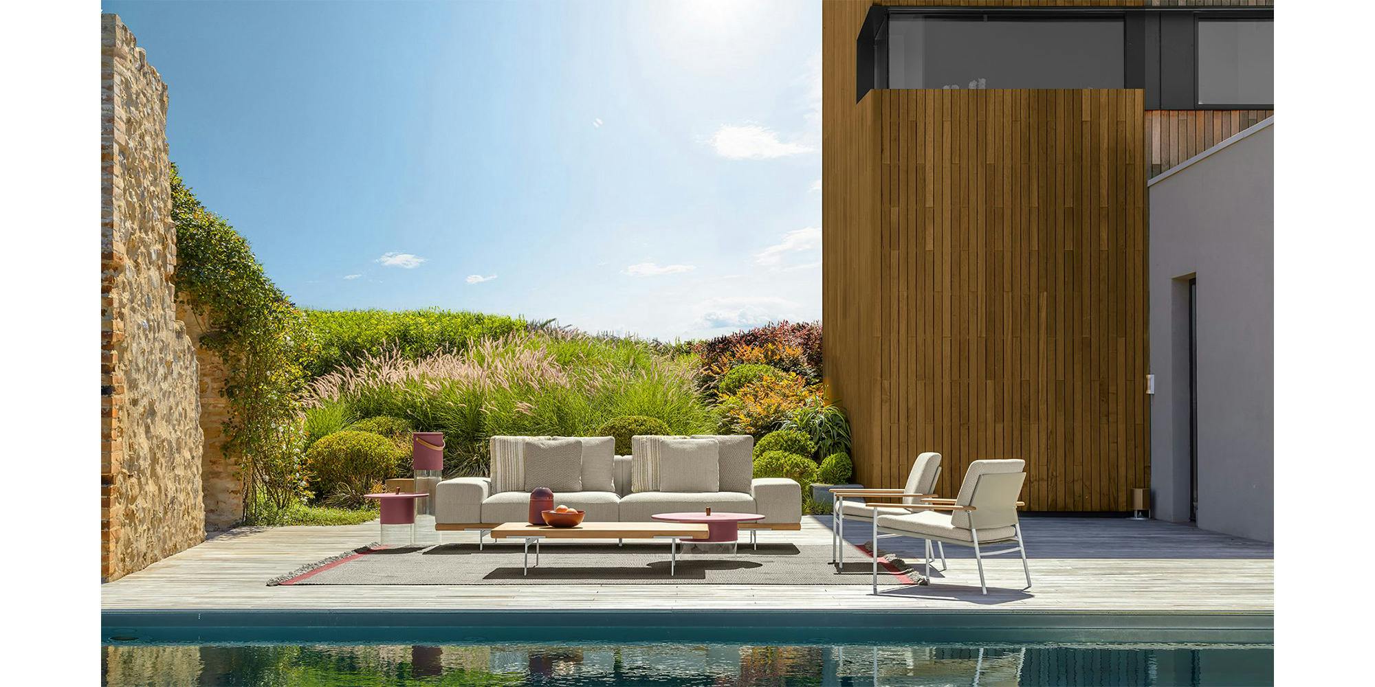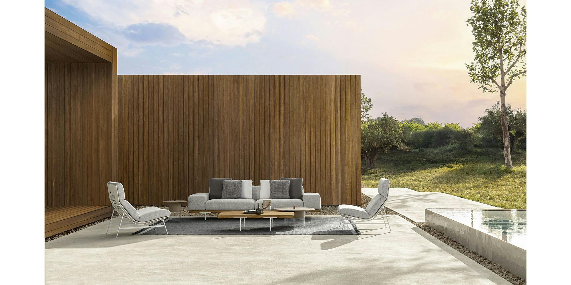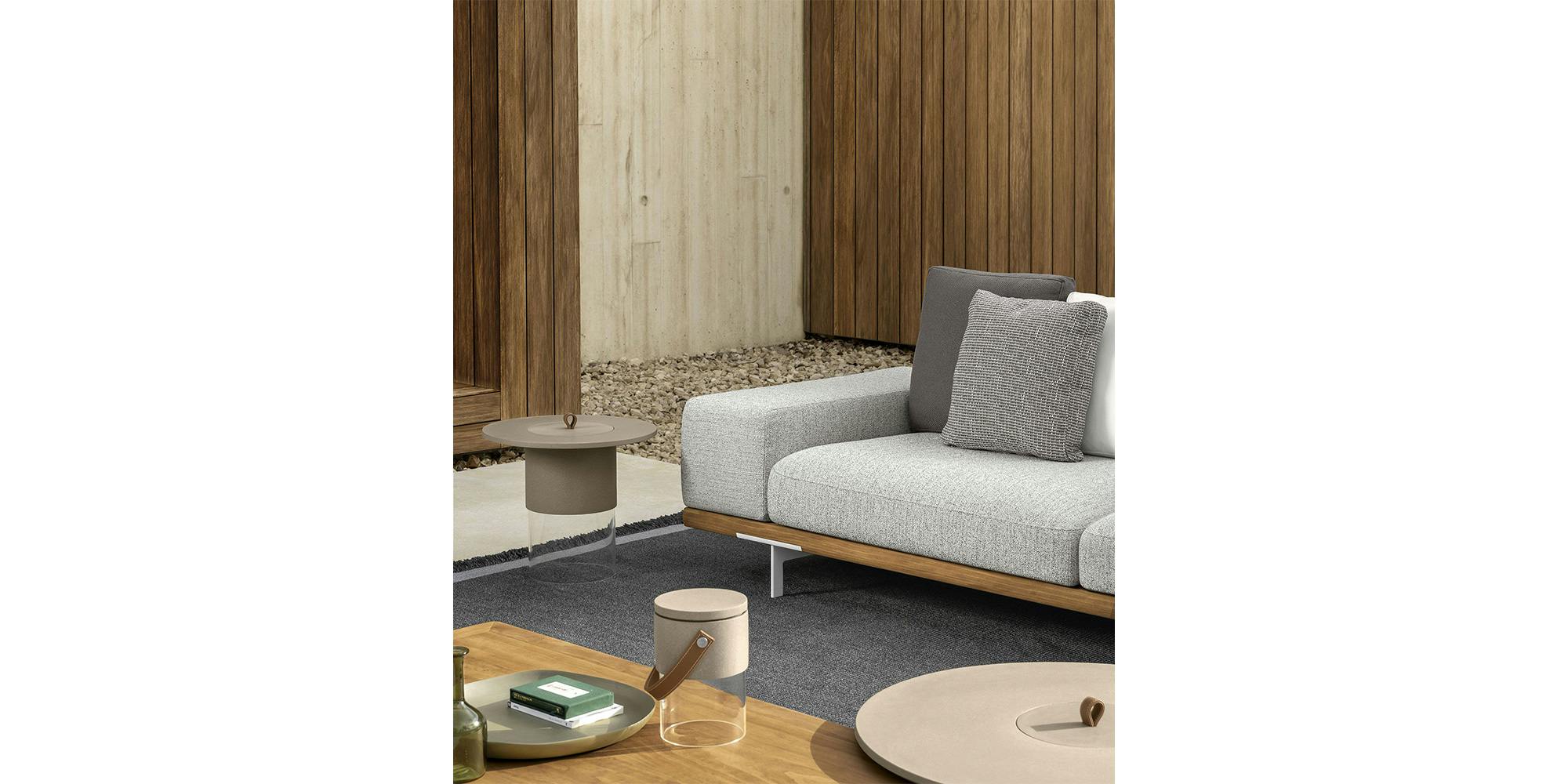The Allure outdoor modular sofa stands out thanks to a solid wooden frame, supported by elegant aluminium feet. A contemporary sofa bound to tradition. The linear geometry of the cushions, combined with the design of the armrests, available in two versions, allows endless combinations, each with its own character and style. Thanks to its unusual modularity, design variability, and resistant materials, the outdoor space appears informal yet elegant.