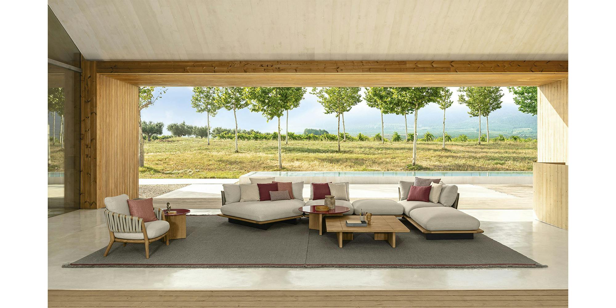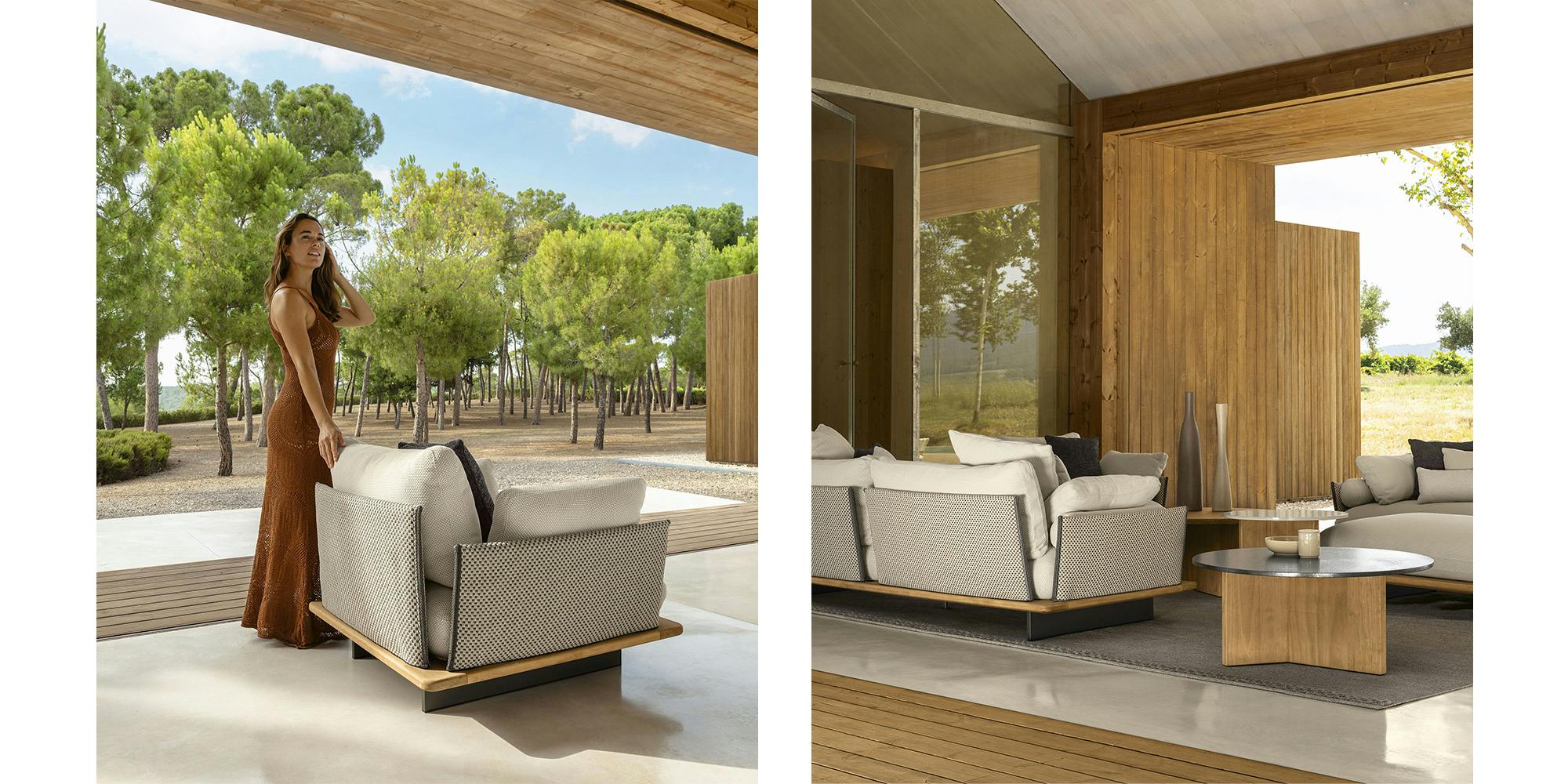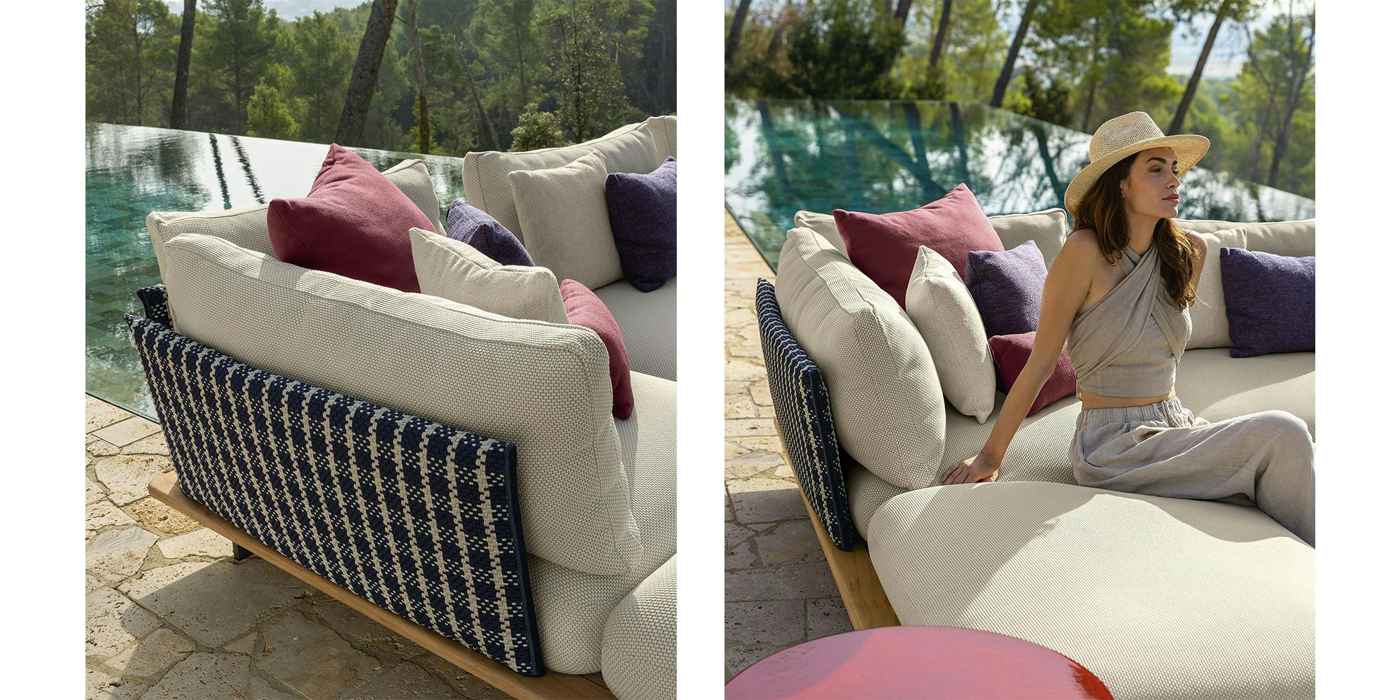The modular sofa Venice recalls the image of boats that ply the Venetian waterway, thanks to the large seats lying on the wooden bases with a floating design. The cushions are defined by soft lines, backs and armrests are covered in full nautical style and the bases in teak wood and accoya evoke the artisan finishes of the vessels. The combination of these elements conveys a sense of lightness and charm that radiates throughout the garden. The wide choice of materials and the many modular combinations in which it is available allow you to customize and adapt the Venice sofa to the outdoor living room with great versatility.
