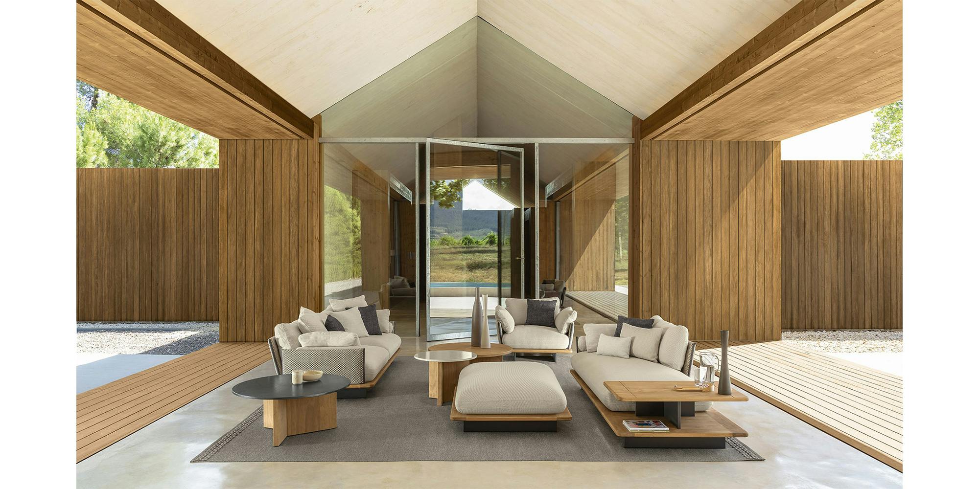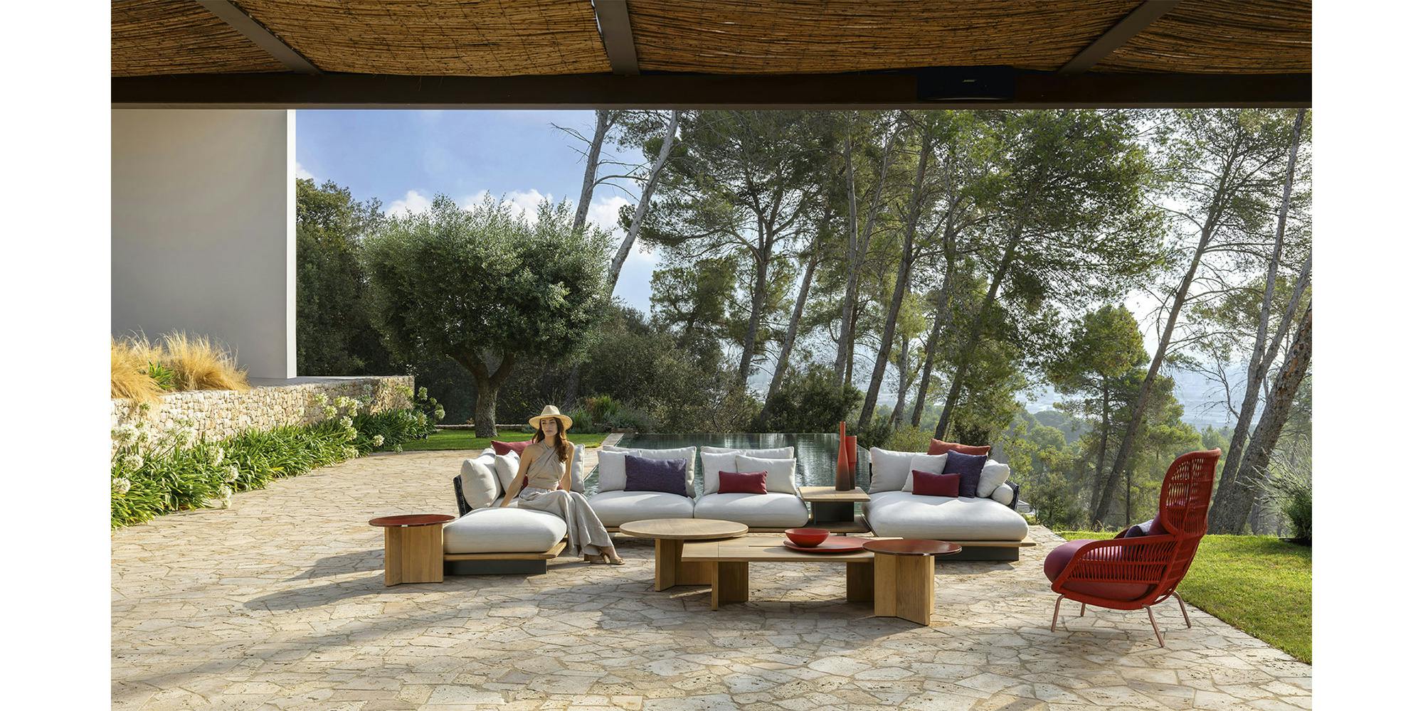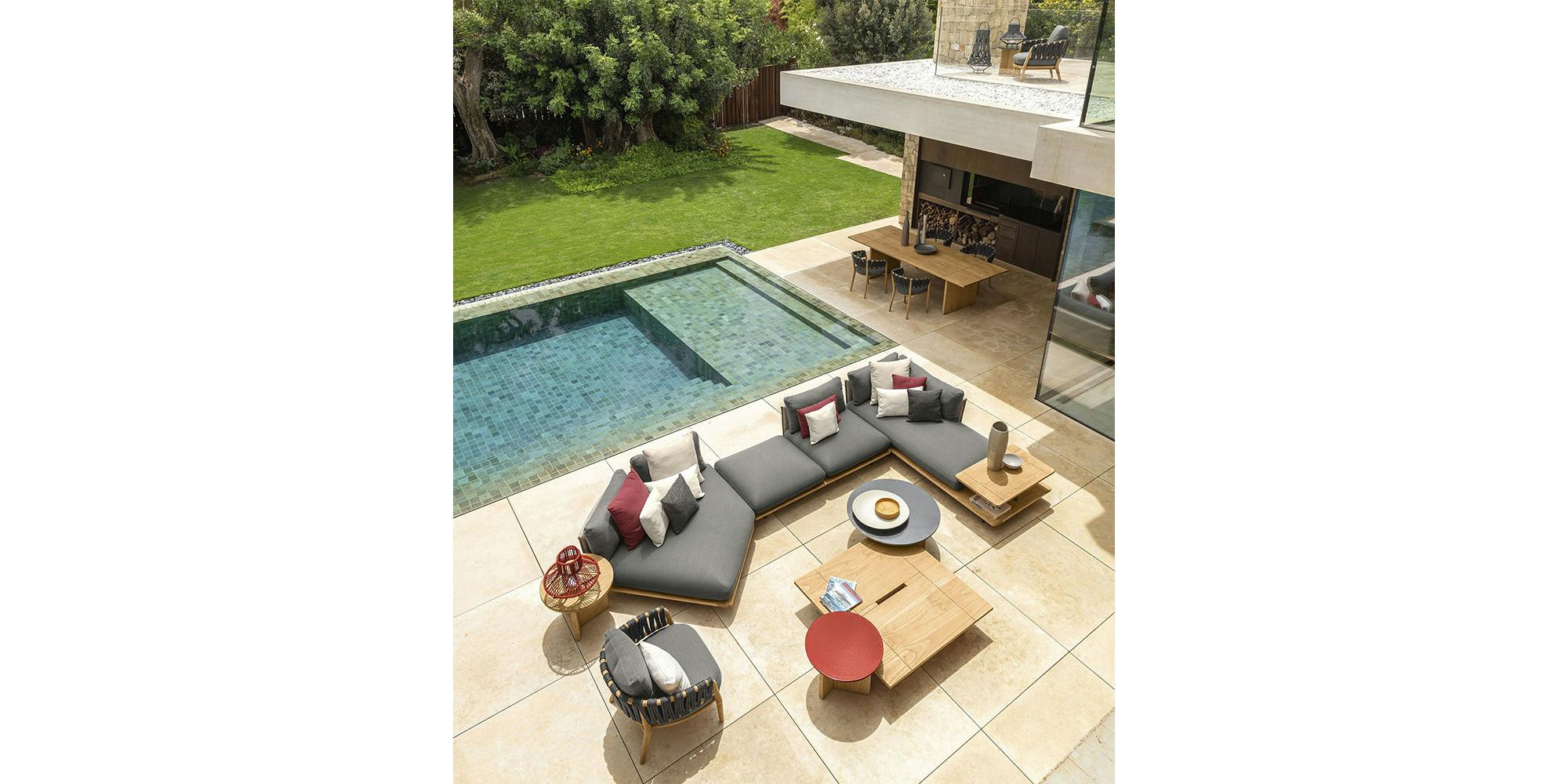 The modular sofa Venice recalls the image of boats that ply the Venetian waterway, thanks to the large seats lying on the wooden bases with a floating design. The cushions are defined by soft lines, backs and armrests are covered in full nautical style and the bases in teak wood and accoya evoke the artisan finishes of the vessels. The combination of these elements conveys a sense of lightness and charm that radiates throughout the garden. The wide choice of materials and the many modular combinations in which it is available allow you to customize and adapt the Venice sofa to the outdoor living room with great versatility.