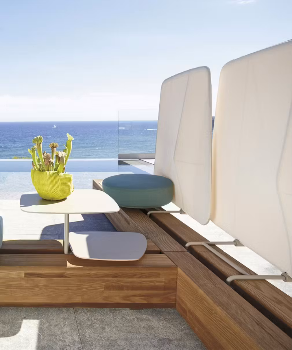 Outdoor round Pouf. Meandering and comfy this pouf needs to be placed in the beam creating relax areas in wide outdoor spaces, like terraces, pools and patios.