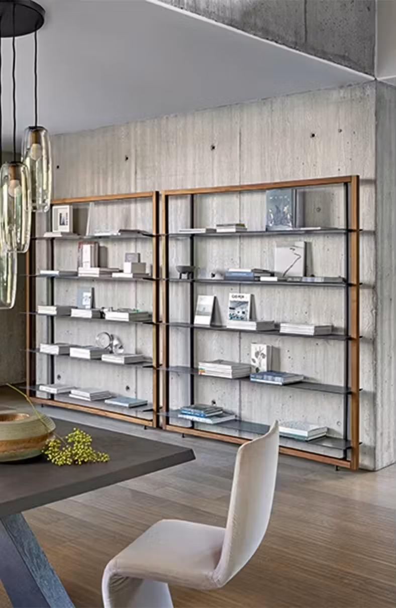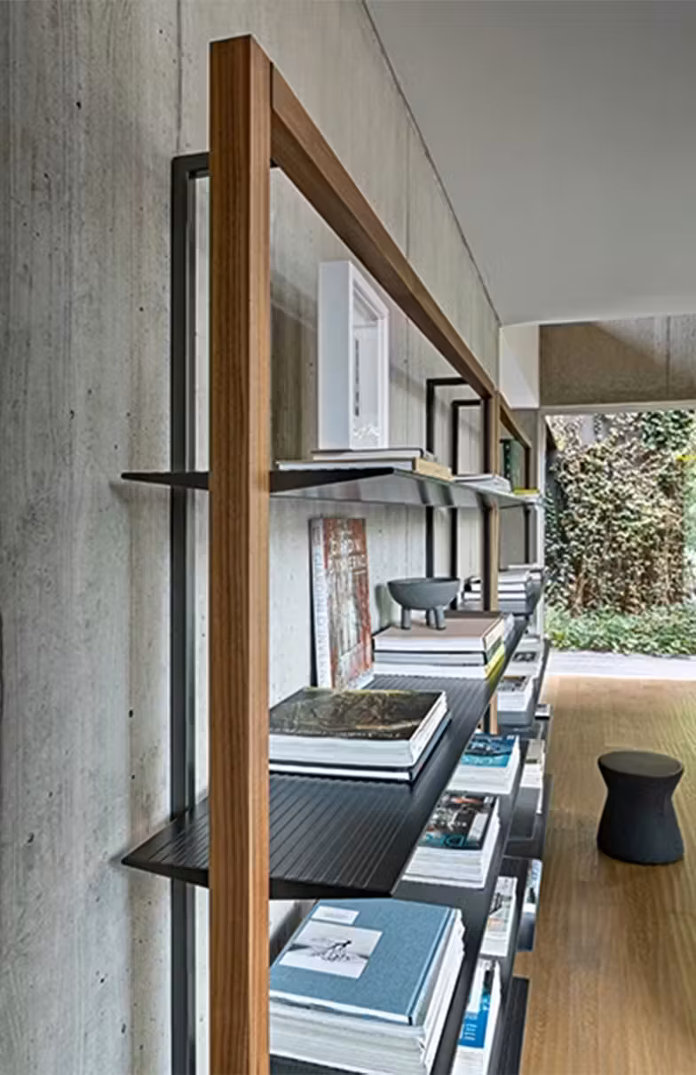 With its wooden frame protruding from the wall-mounted metal structure, the Alix lightweight bookcase furnishes the wall by breaking its monotony. The careful choice of materials is at the core of this project, consisting of simple and linear shapes: the concept is strengthened by the use of aluminium, a cold and tenacious material that makes the structure optically light, combined with the warmth of the wood, the real star of Alix’s design.