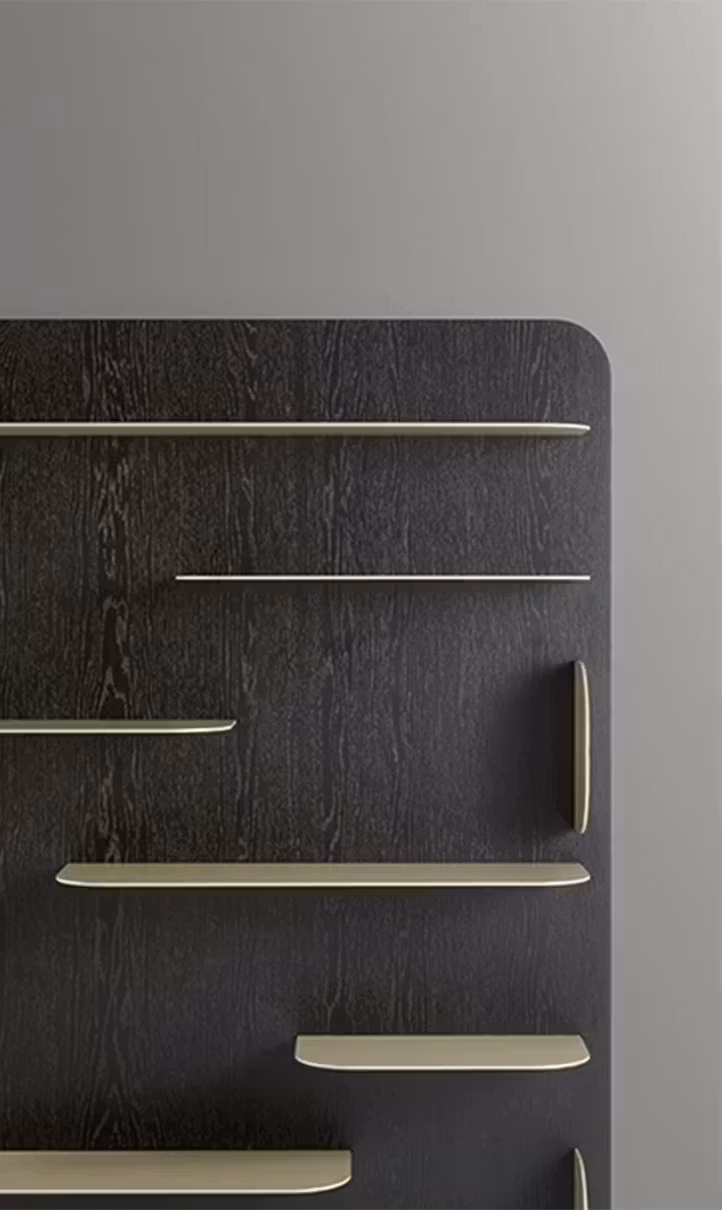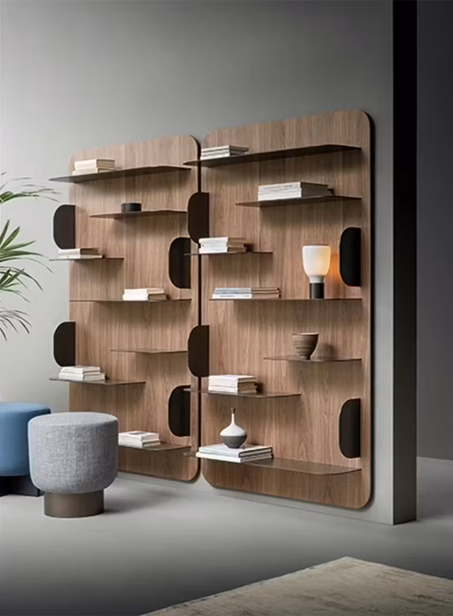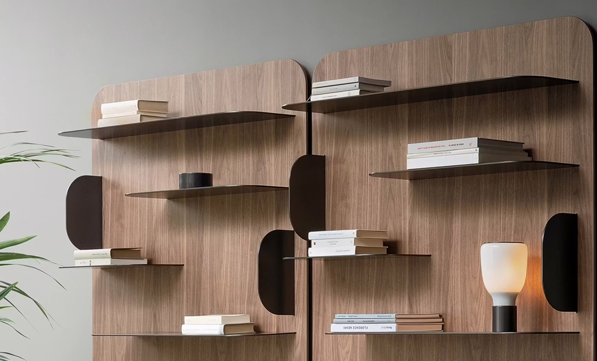 The Blabla collection consists of two different functional units, a contemporary design bookcase panel and a mirror panel, which when paired together create a system of elements that can be individually positioned or combined in an elegant composition. The distinguishing feature of the Blabla contemporary bookcase and mirror is the rounded profile of the shelves and side support panel, as well as the interruption and discontinuity of the shelves. The Blabla collection consists of a thick panel in Canaletto walnut or coal ash wood, contrasting with slender metal shelves; the bookcase is wall-hung and comes with shelves of various lengths.