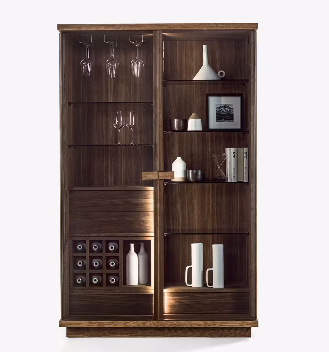 Multi-functional storage unit made of plywood with double smoked glass door with an angle of 90 degrees and grooved wooden handle. Unit and inner fittings are designed to meet container and functional needs and include two wood drawers, assembled with dovetail joints and equipped with a push-pull opening system together with a series of glass shelves. The interior spaces are illuminated by a LED lighting system positioned across the entire height of the inner side. It is activated automatically via internal sensors with the passage of the hand.