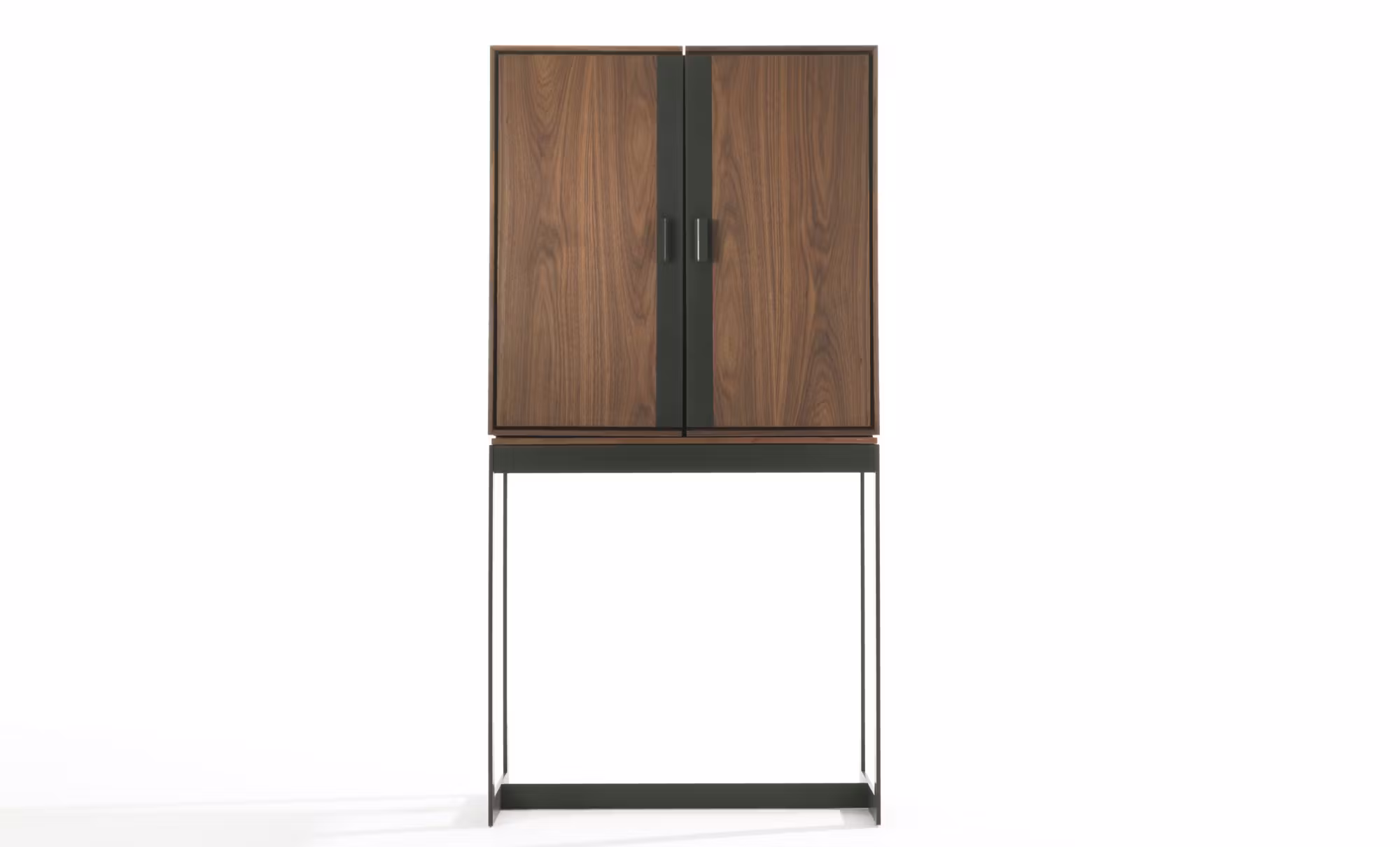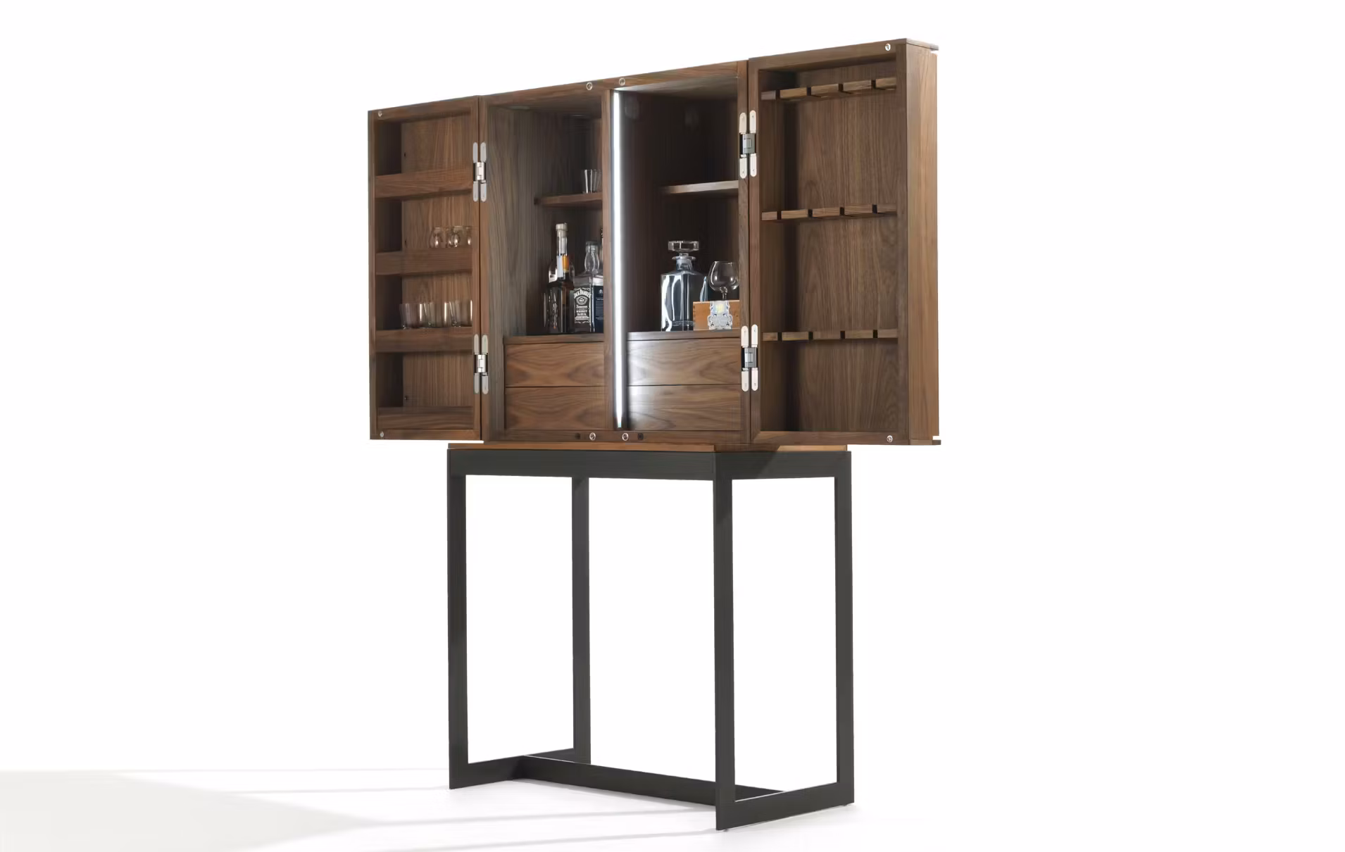 A multi-functional double door storage unit with handcrafted interior accessories, perfect for elegantly displaying wines, spirits or other items.  The large grooved doors and hardwood drawers allow you to organise glasses and decanters while the interior spaces are illuminated by a LED lighting system positioned across the entire height of the inner side.