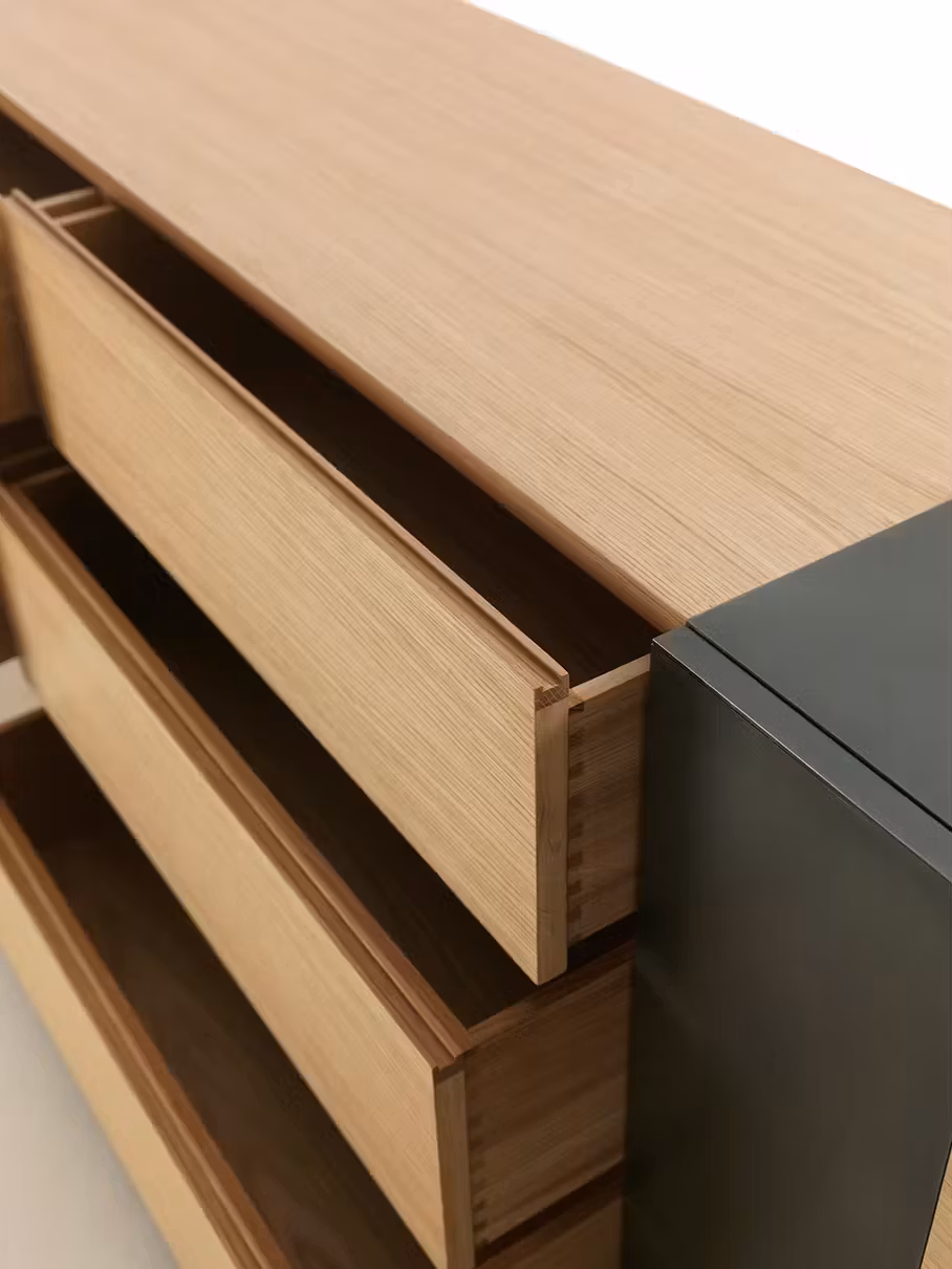 A minimal design of great style and elegance, whose distinctive feature is a vertical iron strip echoing one of the drawers with an iron front.