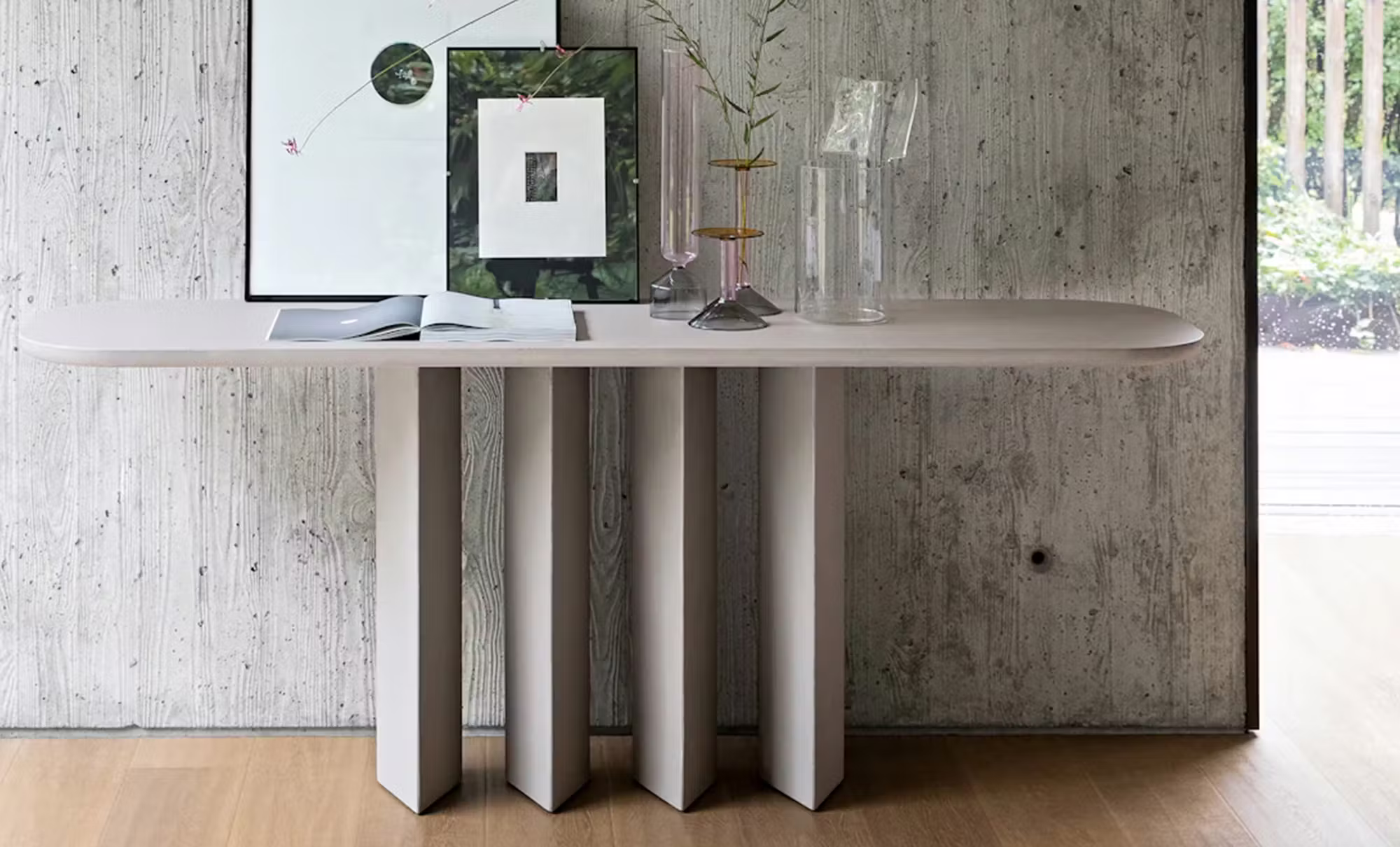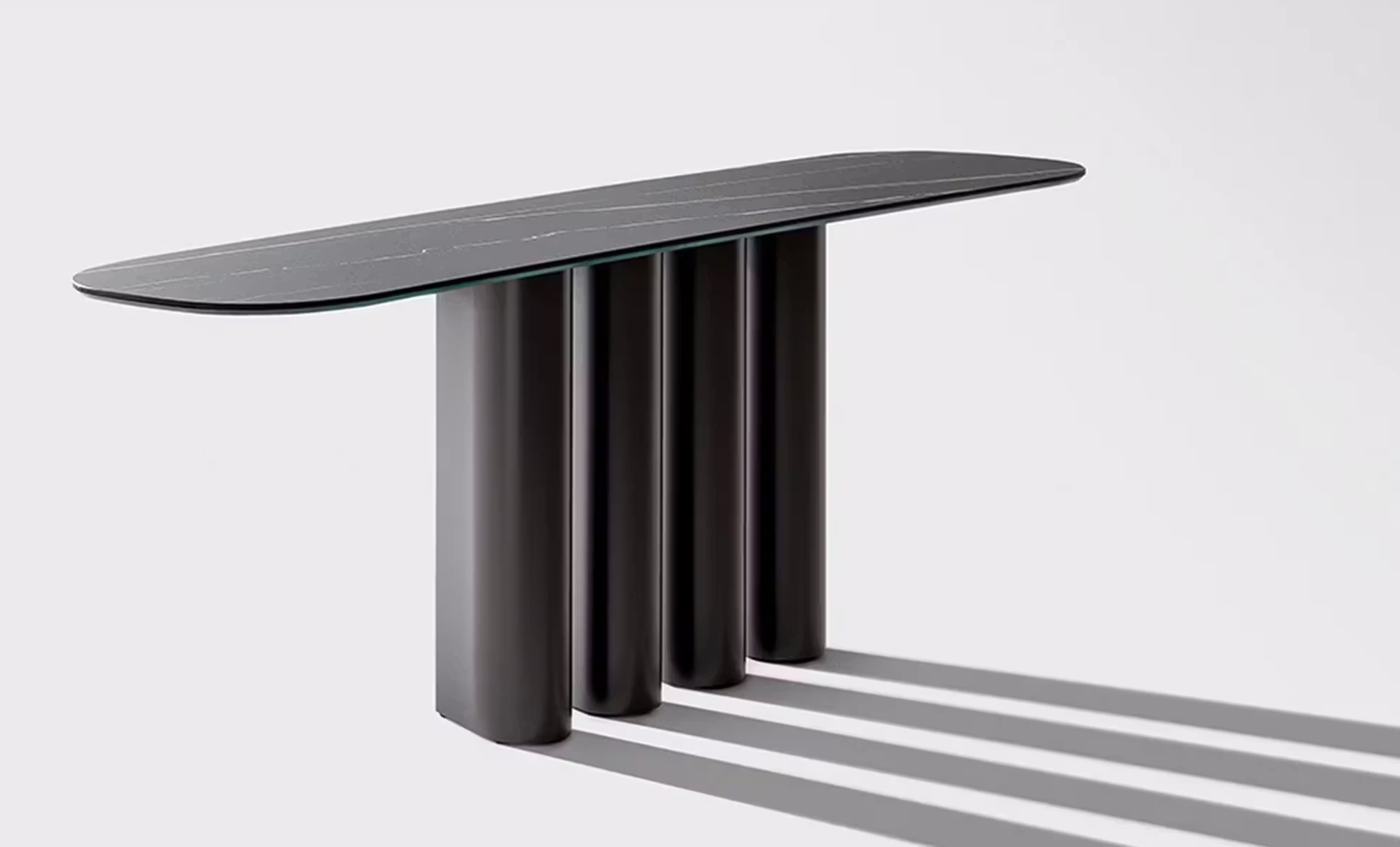 The base features four teardrop-shaped legs, both chunky and sleek and tapered all at once, making it a contemporary console that captivates with its unique design. As such, your perception of the weight of the piece changes as you move around it.