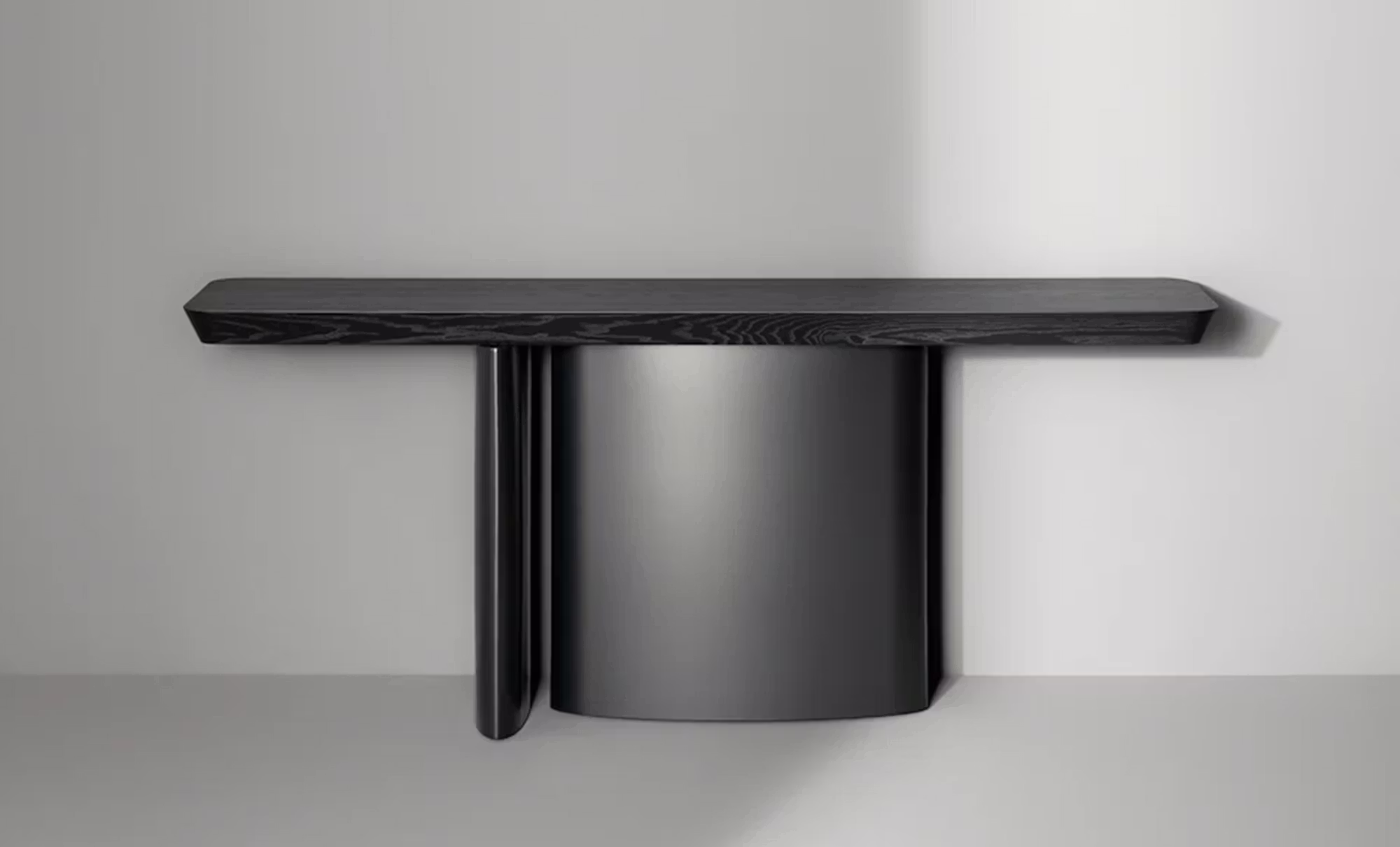 The One Console presents an unexpected, unique and in some ways imperfect piece of architecture that recalls the Dolmens of prehistoric times, which were created by stacking irregular stones in a way that was apparently random and precarious. It is as if the elements that make up the console were not intended to be together, but had instead shifted unexpectedly away from their original position, thereby giving life to a contemporary and recognizable accessory with a striking top and unusual bases. A barely visible opening between the curved modules that form the base allows an interplay of light that illuminates the different profiles of the console’s supporting columns. The legs are very close to each other, so much so that from different perspectives the distance is imperceptible; this generates visual instability and a surprising dynamic effect. At the same time, the interplay between the legs gives direction to the console, and therefore to the space in which it is placed. These unusual features give the product a personal richness, making it unique and particularly unexpected.